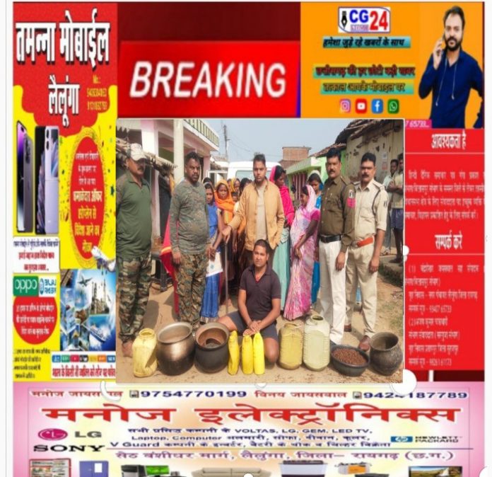 ● टीआई लैलूंगा अपने स्टाफ के साथ ग्राम बगुडेगा में दबिश देकर किये कार्रवाई, कई स्थानों पर महुआ लहान का नष्टीकरण, 8 लीटर महुआ के साथ आरोपी गिरफ्तार…… *रायगढ़* । वरिष्ठ पुलिस अधीक्षक श्री सदानंद कुमार के निर्देशन पर जिला पुलिस द्वारा समाजिक बुराई अवैध शराब, जुआ-सट्टा के खात्मे के लिए ग्राम स्तर पर महिला समिति का गठन किया जा रहा है जिन्हें पुलिस अधिकारियों द्वारा गांव में जुआ, शराब की सूचनाएं देने प्ररित किया गया है । अब गांव में गठित महिला समिति के सदस्यों द्वारा गांव में अवैध रूप से बनाई जा रही महुआ शराब पर कार्रवाई के लिए सूचनाएं दी जा रही है । इसी क्रम में आज दिनांक 02/01/2024 को थाना प्रभारी लैलूंगा निरीक्षक मोहन भारद्वाज को ग्राम बगुडेगा के महिला समिति के सदस्यों द्वारा गांव के मकरध्वज राठिया द्वारा अवैध रूप से महुआ शराब बनाकर विक्रय करने की सूचना दिया गया । तत्काल थाना प्रभारी अपने स्टाफ के साथ ग्राम बगुडेगा पहुंचे और सूचनाओं पर ताबड़तोड कार्रवाई करते हुये, कई स्थानों पर अवैध महुआ शराब बनाने के लिये रखे गये महुआ लहान का नष्टीकरण किया गया तथा ग्रामीणों को अवैध शराब बनाने पर कड़ी कार्रवाई की चेतावनी दिये । इसी दरम्यान अवैध शराब बिक्री की सूचना पर संदेही मकरध्वज राठिया के घर जाकर संदेही को तलब किया गया और अवैध शराब बिक्री के संबंध में पूछताछ करने पर उसने महुआ शराब बिक्री हेतु रखना स्वीकार किया और घर से निकालकर दो 05 लीटर क्षमता के जरीकेन के जरीकेनों में रखे 04-04 लीटर भरा हुआ जुमला *08 लीटर कच्ची महुआ शराब किमती 800/- रूपये* लाकर पेश किया जिसकी विधिवत जप्ती कर *आरोपी मकरध्वज राठिया पिता रोहित राठिया उम्र 32 वर्ष निवासी बगुडेगा* पर थाना लैलूंगा में धारा 34 (2), 59 (क) आबकारी एक्ट के तहत कार्रवाई किया गया है । थाना प्रभारी लैलूंगा निरीक्षक मोहन भारद्वाज के साथ संपूर्ण कार्रवाई में एएसआई कमल सिंह राजपूत, प्रधान आरक्षक सोमेश गोस्वामी, भेनानसियुस खेस, राम रतन और हमराह स्टाफ शामिल थे ।