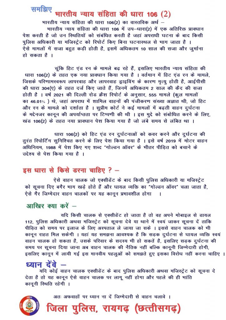 *रायगढ़* । हिट एंड रन केस को लेकर बीते दो दिनों से देशव्यापी हड़ताल के आज दूसरे दिन सुबह से ही पुलिस मुस्तैद थी । विभिन्न चौक-चौराहों पर जहां ट्रेलर/ट्रक वाहन संघ द्वारा इकट्ठा हुए थे । उन्हें पुलिसकर्मियों द्वारा नियंत्रण कक्ष रायगढ़ में आयोजित बैठक में शामिल होने हेतु तलब किया गया जिस पर वाहन चालक संघ, ट्रेलर मालिक संघ और ऑटो चालक संघ के पदाधिकारी और सदस्यगण भारी संख्या में पुलिस नियंत्रण कक्ष में उपस्थित हुए । मौके पर ही जिला अभियोजन अधिकारी श्री सिद्वार्थ ठाकुर द्वारा सबसे पहले भारतीय न्याय संहिता की धारा 106(2) का सही अर्थ और उसकी व्यवख्या की समझाइए दी गई । साथ ही साथ रायगढ़ पुलिस द्वारा इस कानूनी प्रावधान के संबंध में एक व्याख्या नोट पृथक से वाहन चालक संघ को शेयर किया गया है । मीटिंग में उपस्थित पुलिस अनुविभागीय अधिकारी धरमजयगढ़ दीपक मिश्रा द्वारा वाहन चालक संघ के सदस्यगणों को प्रशासन और पुलिस की दी गई समझाइश का पालन करने बताया गया । साथ ही आवश्यक वस्तुओं जैसे फ्यूल टैंक, अनाज, दवाईयां इत्यादि के परिवहन को बाधित ना करने और हड़ताल खत्म करने की अपील की गई । एसडीएम रायगढ़ गगन शर्मा ने बीते दो दिनों में जिले की लाइन ऑर्डर की जानकारी दी गई और हड़ताल से आमजन को हो रही समस्याएं के संबंध में वाहन चालक संघ के पदाधिकारी और ड्रायवरों को जल्द हड़ताल समाप्त करने की अपील किया गया । मीटिंग पश्चात संघ के पदाधिकारियों और ड्रायवरों ने आश्वस्त किया गया कि उनकी हड़तल से आमजन को परेशानी नहीं होगी । मीटिंग में ट्रैफिक डीएसपी रमेश चंद्रा, चालक संघ के संजय बाजपेयी, सतीश कुमार चौबे, विकास अग्रवाल, सुरेश अग्रवाल, सत्यदेव तिवारी, चिंतामणी शर्मा, मनोज सिंह, फुलेन्द्र मिश्र, अरविंद दुबे, शशिभूषण, एजाज अहमद, मुकेश चौबे, मोह0 रूस्तम, संस्कार भारती, संजीत चौहान, कैलाश सिंह, जगत राम, सतीश मिश्रा, रवि सागर, संजय अग्रवाल के साथ अन्य सदस्यगण उपस्थित थे ।
