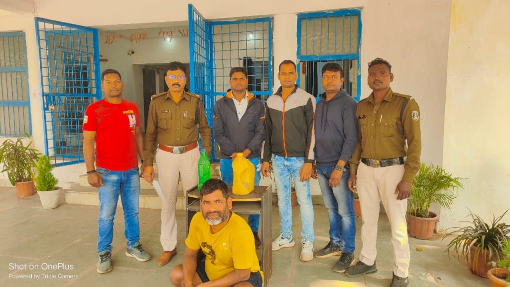 *रायगढ़* । जिले में अवैध शराब पर कार्यवाही के क्रम में कल 04 जनवरी को थाना पुसौर क्षेत्र अंतर्गत साइबर सेल और थाना पुसौर की टीम द्वारा मुखबीर सूचना पर ग्राम रैबार पुराने डामर फैक्टरी के पास आरोपी दीनदयाल आ यादराम उम्र 40 साल निवासी ग्राम रैबार थाना पुसौर को बॉटल और जरकीन में रखे कुल 6.5 लीटर महुआ शराब कीमती 650 रूपये के साथ पकड़ा गया है । पुलिस को सूचना मिली थी कि डामर फैक्टरी रोड़ पर एक व्यक्ति अवैध रूप से शराब की बिक्री कर रहा है । सूचना पर पुलिस टीम ने रेड कार्यवाही कर आरोपी को अवैध शराब के साथ पकड़ा गया, आरोपी दीनदयाल कुर्रे पर थाना पुसौर में आबकारी एक्ट की धारा 34(2),59(क) के तहत कार्यवाही किया गया है । शराब रेड कार्यवाही में थाना पुसौर के सहायक उप निरीक्षक मनमोहन बैरागी, आरक्षक महेश चौहान, डहरू उरांव, साइबर सेल के आरक्षक धनंजय कश्यप, सुरेश सिदार और विक्रम सिंह शामिल थे ।