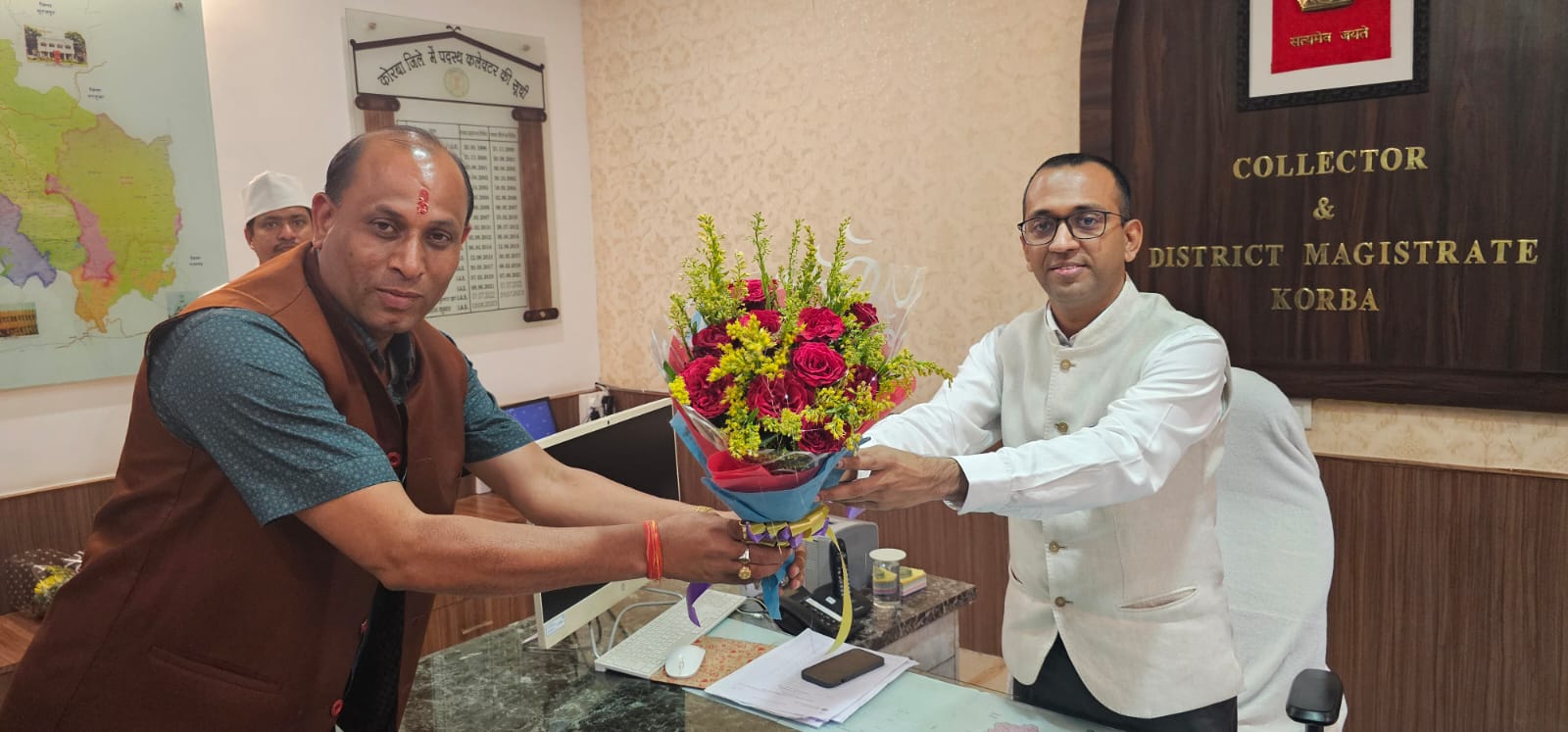 हरदीबाजार- कोरबा नवपदस्थ कलेक्टर अजीत वसंत जी का बुके भेंटकर पूर्व मंडल अध्यक्ष दुष्यंत शर्मा ने किया स्वागत ।
