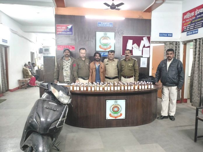 एसएसपी श्री सदानंद कुमार के निर्देशन पर अवैध शराब की बिक्री और परिवहन पर कार्यवाही के लिए थाना प्रभारी कोतरारोड़ निरीक्षक राकेश मिश्रा द्वारा क्षेत्र में मुखबिर सक्रिय किया गया, कल रात्रि मुखबीर से थाना प्रभारी कोतरारोड़ को सूचना मिली कि कोसमनारा का विजय प्रताप सिंह राजपूत अवैध बिक्री के लिए स्कूटी पर अंग्रेजी शराब की तस्करी कर रहा है जो भारी मात्रा में शराब लेकर कलमी अंडर ब्रिज की ओर से जा रहा है । सूचना पर तत्काल थाना प्रभारी द्वारा कलमी की ओर माइनर एक्ट की कार्यवाही के लिए रवाना हुए थाना कोतरारोड़ की टीम को निर्देशित किया गया । सहायक उप निरीक्षक हेमसागर पटेल के हमराह स्टाफ द्वारा रेलवे अंडर ब्रिज के नीचे ग्राम कॉलोनी में घेराबंदी कर स्कूटी पर शराब ले जा रहे संदिग्ध युवक को पकड़ा गया जिससे पूछताछ करने पर अपना नाम *विजय प्रताप सिंह पिता स्वर्गीय मदन सिंह राजपूत उम्र 29 साल निवासी कोसमनारा थाना कोतरारोड़ रायगढ़* का रहने वाला बताया जिसके कब्जे से 96 पाव गोल्डन गोवा शराब कीमत 13,000 रुपए तथा शराब परिवहन में प्रयुक्त एक्टिवा सीजी 13 V-0769 *जुमला कीमती 63,000 रूपये* को जप्त कर आरोपी पर थाना कोतरारोड़ में आबकारी एक्ट की धारा 34(2),59(क) के तहत कार्यवाही किया गया है । शराब रेड कार्यवाही में सहायक उप निरीक्षक हेम सागर पटेल, प्रधान आरक्षक करुणेश राय, जयप्रकाश सूर्यवंशी और आरक्षक मनोज जोल्हे शामिल थे ।
