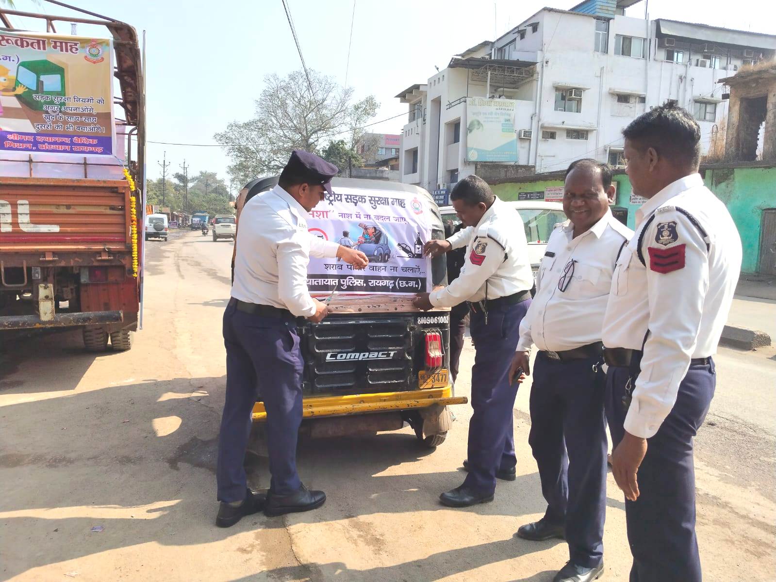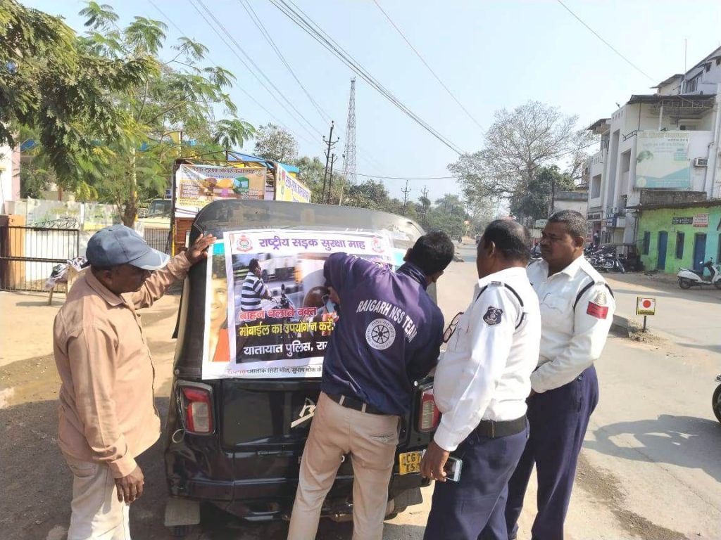 *रायगढ़* । आज दिनांक 16.01.2024 को राष्ट्रीय सड़क सुरक्षा माह 2024 के द्वितीय दिवस यातायात पुलिस रायगढ़ द्वारा यातायात नियमों का पालन करने एवं सुरक्षित यातायात व्यवस्था बनाए रखने आम नागरिकों से अपील करते हुए प्रचार प्रसार किया गया । यातायात पुलिस की टीम द्वारा सेंट जेवियर हायर सेकेंडरी स्कूल बोइरदादर में स्कूली बच्चों एवं अध्यापकों को यातायात निमयों की जानकारी दी गई । इसी क्रम में यातायात पुलिस द्वारा आज लगभग सौ से अधिक सभी प्रकार के वाहनों मे रेडियम टेप लगाया गया तथा शहर में संचालित ऑटो वाहनों में यातायात जागरूकता वाले फ्लेक्स बैनर चिपका कर यातायात नियमों का प्रचार प्रसार किया गया ।