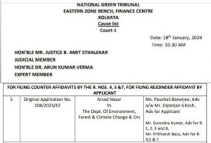 साहिबगंज।जिले के चर्चित सामाजिक कार्यकर्ता सह पर्यावरण प्रेमी सैयद अरशद नसर द्वारा शेखपुरा जिला के टाटी नदी,अगबील चाढ़े व चढ़िहारी सरकारी पथ के किनारे बिना किसी सरकारी अनुमति के लकड़ी माफियाओं द्वारा दर्जनों पेड़ों को काटे जाने को लेकर एनजीटी ईस्टर्न जोन कोलकाता में दायर याचिका संख्या-108/2023 की आज पीठ के जुडिशियल मेंबर जस्टिस बी.अमित स्थालेकर व एक्स्पर्ट मेंबर डा.अरूण कुमार वर्मा सुनवाई करेंगे.सुनवाई पुर्व शेखपुरा जिले के डीएम व लकड़ी माफियाओं को जवाबी हलफनामा दाखिल करना है जबकि शेखपुरा जिले के एसपी व जमुई जिले के डीएफओ द्वारा जवाबी हलफनामा दाखिल कर दिया गया है.सुनवाई में भाग लेने के लिए अरशद कोलकाता पहुँच गए है.आज की सुनवाई पर लकड़ी माफियाओं समेत पत्थर माफियाओं की भी नजरें टिकी हुई है.