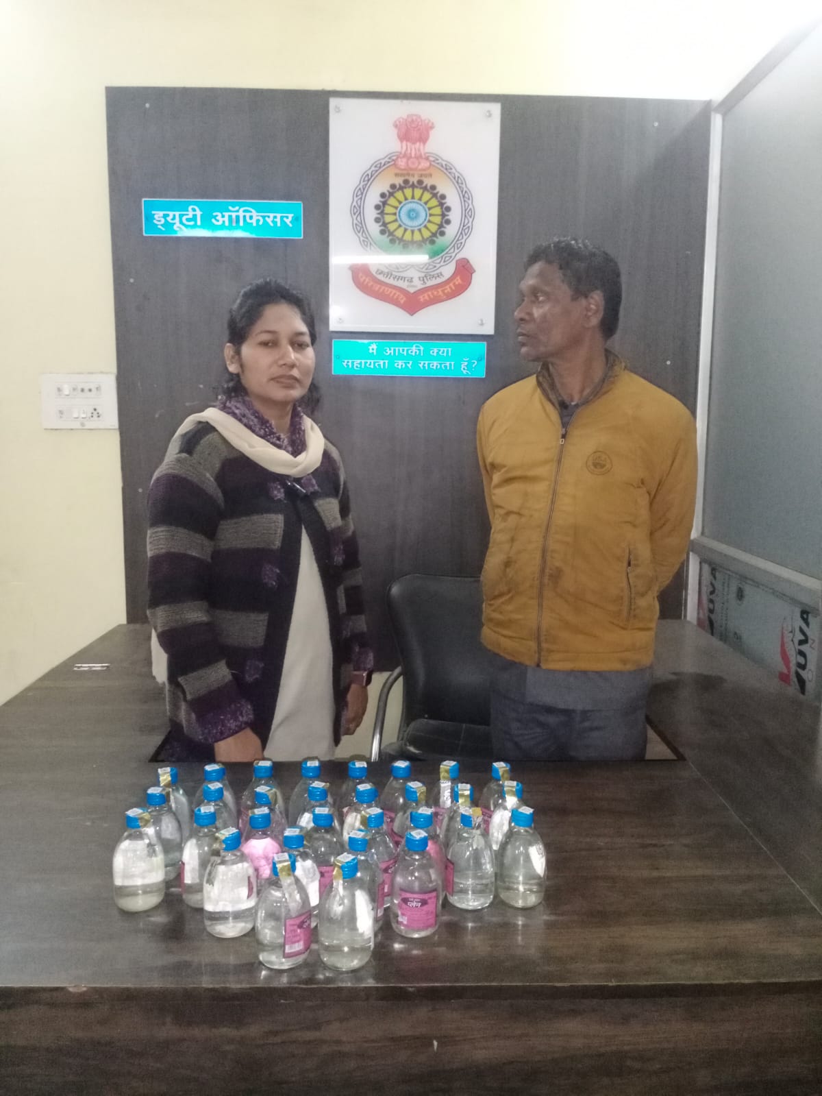अवैध शराब के विरूद्ध चक्रधरनगर पुलिस की लगातार कार्यवाही जारी है । कल दिनांक 17.01.2024 को थाना प्रभारी चक्रधरनगर निरीक्षक प्रशांत राव आहेर के नेतृत्व में चक्रधरनगर पुलिस द्वारा मुखबीर सूचना पर ग्राम कोटरापाली निवासी महेद्र सिंह के गल्ला किराना दुकान में शराब रेड कार्यवाही किया गया । पुलिस को सूचना मिली थी कि महेन्द्र सिंह दुकान पर अवैध रूप से देशी प्लेन मंदिरा शराब रखकर बिक्री करता है । रेड कार्यवाही में आरोपी के पास से 30 पाव देशी मंदिरा प्लेन मदिरा और बिक्री रकम 160 रूपये जप्त किया गया है । *आरोपी महेन्द्र सिंह (उम्र 60 साल) निवासी कोटरापाली* पर थाना चक्रधरनगर में धारा 34(2)59(क)आबकारी एक्ट के तहत कार्यवाही किया गया है । शराब रेड कार्यवाही में महिला प्रधान आरक्षक समुंदर रनकर, आरक्षक विनोज लकड़ा और रूपराम साहू शामिल थे ।