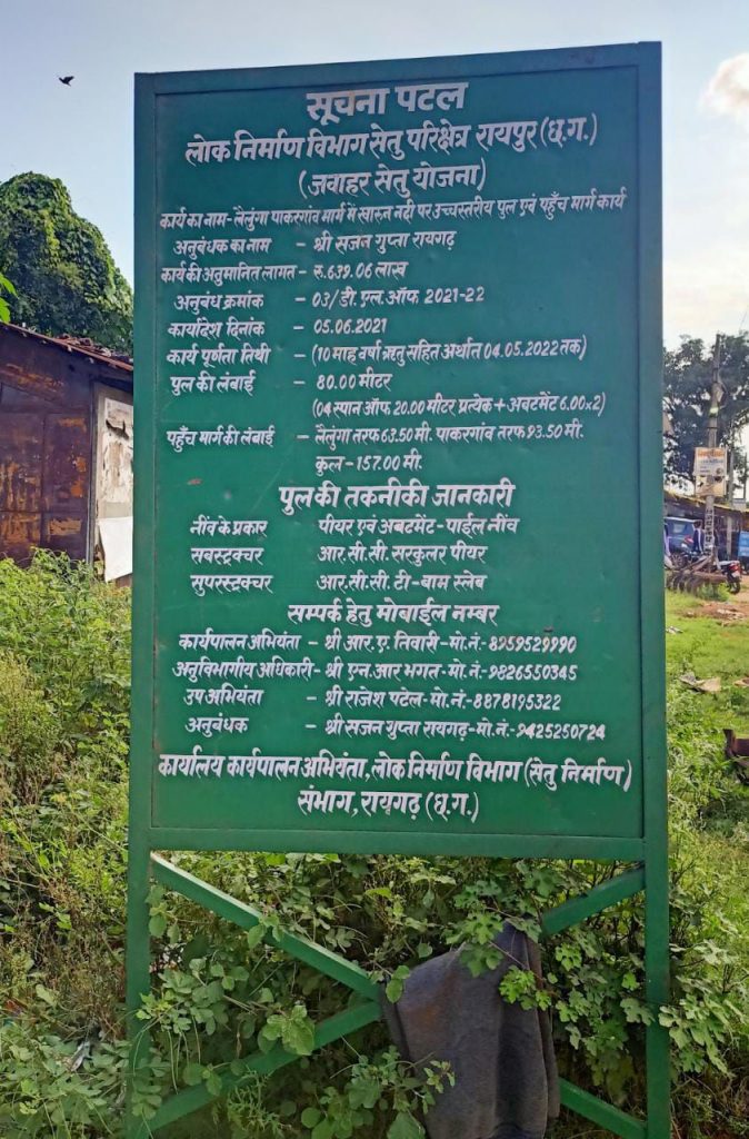 6 करोड़ 40 लाख से खारून नदी पर पुल बन रहा है। पुल से लैलूंगा ब्लॉक के पूर्वी इलाके के ग्रामीण अंचलवासी लाभान्वित निर्माण और सर्वे में कई खामियां उजागर हो रही हैं। निर्माणाधीन पुल के आगे सड़क ही नहीं है। पुल से पाकरगांव जाने वाले मार्ग में जंहा पाकरगांव की तरफ निजी भूमि है। भू-अर्जन की प्रक्रिया भी नहीं शुरू हुई। वही दूसरी ओर दाहिनी तरफ मंदिर व बांयी तरफ निजी मकान स्थित है।ब्रिज को लैलूंगा कोतबा रोड से जोड़ने 13 फीट ऊंचा रिटर्न वॉल प्रस्तावित है, जिससे मंदिर का मुख्य द्वार बंद हो जाएगा।