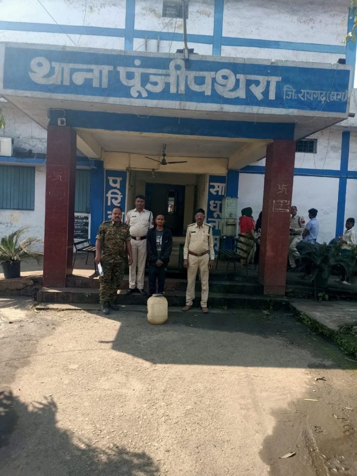*रायगढ़* । कल दिनांक 02/02/2024 को पूंजीपथरा पुलिस द्वारा ग्राम छर्राटांगर में अवैध शराब बिक्री की सूचना पर रेड कार्यवाही किया गया है । थाना प्रभारी पूंजीपथरा निरीक्षक कृष्णकांत सिंह को मुखबीर से सूचना मिली कि ग्राम छर्राटांगर जुनाडीह का तुलसीराम राठिया द्वारा घर पर अवैध रूप से महुआ शराब बिक्री कर रहा है । सूचना पर थाना प्रभारी द्वारा तत्कार माइनर एक्ट की कार्रवाई के लिए रवाना हुए स्टाफ को कार्यवाही करने निर्देशित किया गया । पूंजीपथरा की टीम द्वारा ग्राम छर्राटांगर में दबिश देकर संदेही तुलसी राठिया को तलब किया गया जिसने शराब बेचना स्वीकार किया है जिसके कब्जे से प्लास्टिक डब्बा में रखा हुआ 15 लीटर महुआ शराब कीमत ₹1500 का विधिवत जप्त किया गया । थाना पूंजीपथरा में *आरोपी तुलसीराम राठिया पिता राम सिंह राठिया उम्र 22 साल निवासी छर्राटांगर जुनाडीह* पर धारा 34(2), 59(क) आबकारी एक्ट के तहत कार्यवाही किया गया है । शराब रेड कार्यवाही में टीआई कृष्णकांत सिंह, सहायक उप निरीक्षक चंदन सिंह नेताम, प्रधान आरक्षक अमृत तिर्की, लाजरूस मिंज और आरक्षक उमाशंकर भगत शामिल थे ।