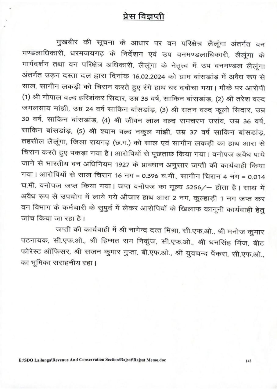 मुखबिर की सूचना के आधार पर वनपरिक्षेत्र लैलूंगा अंतर्गत वनमण्डलाधिकारी धरमजयगढ़ के निर्देशन एवं उप वनमण्डलाधिकारी लैलूंगा के मार्गदर्शन तथा वनपरिक्षेत्र अधिकारी लैलूंगा के नेतृत्व में उप वनमंडल लैलूंगा अंतर्गत उड़न दस्ता दल द्वारा दिनांक 16.02.24 को ग्राम बांसडांड में अवैध रूप से साल, सैगन लकड़ी को चिरान करते हुए रंगे हांथ धर दबोचा गया मौके पर आरोपी,गोपाल वल्द हरिशंकर सिदार उम्र 35 वर्ष सकिन बांसडांड तरेस वल्द जमल साय माझी, उम्र 24 वर्ष सकिन बांसडांड, सतन वल्द फूलो सिदार उम्र 30 वर्ष सकिन बांसडांड , जीवन लाल वल्द रामचरण उरांव उम्र 36 वर्ष सकिन बांसडांड, श्याम वल्द, नकुल माझी उम्र 37 वर्ष सकिन बांसडांड तहसील लैलूंगा जिला रायगढ़ छत्तीसगढ़ को साल एवं सौगन लकड़ी का हांथ आरा से चिरान करते हुए पकड़ा गया, आरोपियों से पूछताछ किया गया वनोपज अवैध पाया गाया आरोपियों से साल चिरान 16 नग =0.396 घ. मि. सौगन चिरान 4 नग =0.014 घ. मि. वनोपज जप्त किया गया जप्त वनोपज का मूल्य 5256