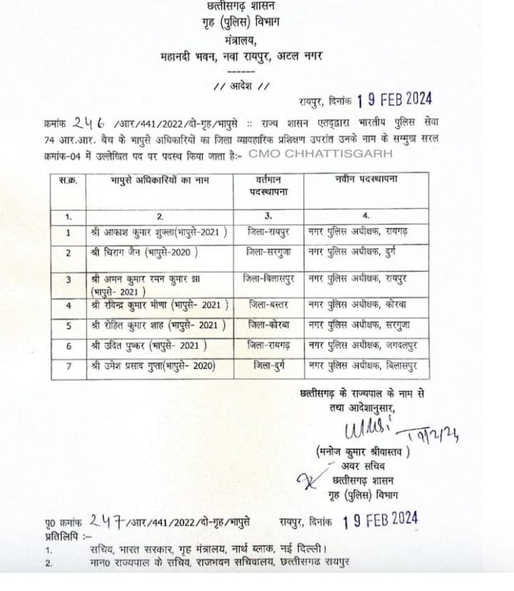 रायपुर/ पुलिस मुख्यालय ने 2021 बैच के आईपीएस अधिकारियों को प्रोबेशन पीरियड के बाद फ़र्स्ट पोस्टिंग दे दी गई है। 2021 बैच के ये सात आईपीएस अधिकारियों को सात ज़िला मुख्यालयों में बतौर सीएसपी तैनात किया गया है। जिसमे आकाश शुक्ला को सीएसपी रायगढ़, चिराग़ जैन सीएसपी दुर्ग, अमन कुमार रमन कुमार झा सीएसपी रायपुर,रविंद्र कुमार मीणा सीएसपी कोरबा,, रोहित कुमार शाह सीएसपी सरगुजा, उदित पुष्कर सीएसपी जगदलपुर और उमेश कुमार गुप्ता को सीएसपी बिलासपुर नियुक्त किया गया है।