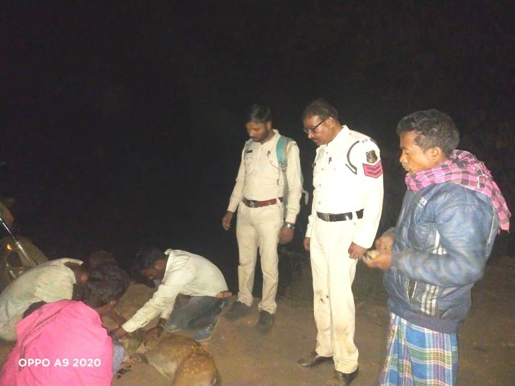 *रायगढ़* । कल रात्रि करीब 08.00 बजे थाना प्रभारी पूंजीपथरा निरीक्षक त्रिनाथ त्रिपाठी को बंजारी मंदिर के आगे घरघोड़ा मुख्य मुख्य मार्ग पर एक घायल हिरण के पड़े होने की सूचना मिली । थाना प्रभारी क्षेत्र में पेट्रोलिंग कर रहे अपने स्टाफ को मौके पर भेजे । मौके पर थाना पूंजीपथरा स्टाफ और वनकर्मी पहुंचे, जहां सड़क पार करते किसी वाहन से टकराने से हिरण घायल होकर तड़प रहा था । मौके पर ग्रामीणों की मदद से हिरण का प्राथमिक उपचार कराया गया जिसके बाद वनकर्मी ने हिरण को अपने कब्जे में लेकर उसका बेहतर उपचार कराया गया और हिरण को वापस वन में छोड़ा गया है ।