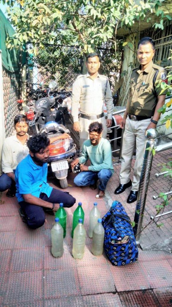 *रायगढ़* । पुलिस अधीक्षक श्री दिव्यांग कुमार पटेल के निर्देशन पर सभी थाना क्षेत्र अंतर्गत डेरावाले, फेरी वाले एवं संदिग्ध घुमंतू किस्म के व्यक्तियों की सघन जांच की जा रही है । इसी कड़ी में कल दिनांक 22/02/2024 को खरसिया क्षेत्र में प्रशिक्षु डीएसपी अमन लखीसरानी के नेतृत्व में पुलिस चौकी खरसिया की टीम द्वारा क्षेत्र में संदिग्धों की जांच दरमियान पुलिस चौकी खरसिया की टीम द्वारा मुखबीर सूचना पर तलवापार हमालपारा के पास स्कूटी सीजी 13 ए.डब्लू. 7718 में शराब परिवहन करते तीन युवक को पकड़ा गया है । तीनों युवक हमालपारा खरसिया के रहने वाले जिनके कब्जे से दो-दो लीटर वाले 6 प्लास्टिक बॉटल में भरा हुआ *12 लीटर महुआ शराब कीमत करीब ₹1200 तथा शराब परिवहन में प्रयुक्त हीरो स्कूटी डेस्टिनी 125 सीजी 13 ए0डब्लू0 7718 कीमत ₹50,000 को जप्त* किया गया है । शराब परिवहन कर रहे आरोपी- (1) प्रदीप कुमार भारती पिता आकाश भारती उम्र 31 साल (2) विक्की सहिस पिता राजेश सहिस उम्र 26 साल (3) चलक राम सहिस पिता रामू सहिस उम्र 29 साल सभी हरिजन मोहल्ला हमालपारा खरसिया के विरूद्ध चौकी खरसिया (थाना खरसिया) में धारा 34(2), 59(क) आबकारी एक्ट के तहत कार्यवाही कर आरोपियों को न्यायिक रिमांड पर भेजा गया है । शराब रेड कार्यवाही में प्रधान आरक्षक अशोक देवांगन, आरक्षक साविल चंद्रा और डमरूधर पटेल शामिल थे ।