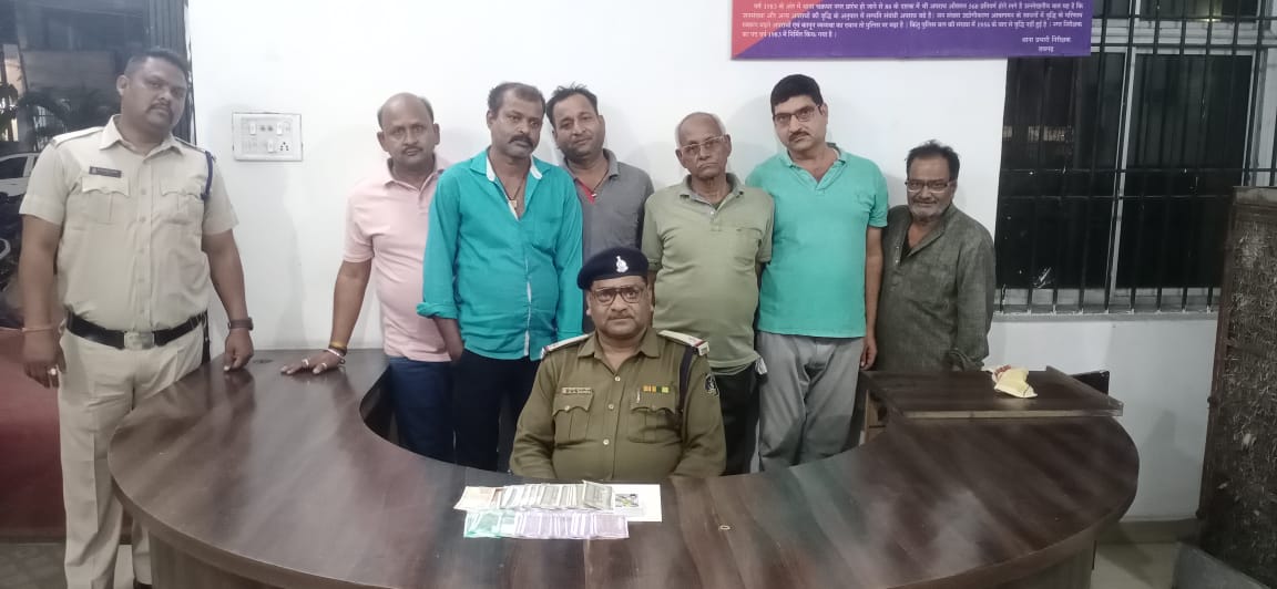 *रायगढ़* । आज दिनांक 27/02/2024 के दोपहर थाना प्रभारी कोतवाली निरीक्षक शनिप रात्रे को मुखबिर से संजय मार्केट में कुछ व्यक्तियों के 52 पत्ती ताश से काट पत्ती नामक जुआ खेलने की सूचना मिली । थाना प्रभारी द्वारा तत्काल उप निरीक्षक दिलीप कुमार बेहरा के हमराह स्टाफ कार्यवाही के लिए रवाना किया गया । कोतवाली पुलिस की टीम द्वारा संजय मार्केट चबूतरा में जुआ खेल रहे –(1) अरुण गुप्ता पिता मामनचंद 53 साल पहाड़ मंदिर रोड सूर्या विहार रायगढ़ (2) दीपक पेशवानी पिता नारायण दास 47 साल बोईरदादर रायगढ़ (3) पंकज अग्रवाल पिता फूलचंद अग्रवाल उम्र 40 साल पहाड़ मंदिर रोड रायगढ़ (4) रमेश कुमार अग्रवाल पिता स्वर्गीय दीप चंद्र अग्रवाल 65 साल निवासी जूटमिल गेट के सामने रायगढ़ (5) निताई विश्वास पिता रामायण विश्वास उम्र 55 साल जूटमिल महरापारा रायगढ़ (6) मुरलीधर शर्मा पिता रामप्रताप शर्मा उम्र 64 साल कोतरारोड़ विकास नंबर गली नंबर 1 रायगढ़ को पकड़ा गया जिनके पास और फड से नगदी रकम 16,800 एवं 52 पत्ती ताश की जप्ती की गई है । आरोपियों पर थाना कोतवाली में जुआ एक्ट के तहत कार्यवाही किया गया है । जुआ रेड कार्यवाही में थाना कोतवाली के सहायक उप निरीक्षक डी.के.बेहरा, आरक्षक जगमोहन ओग्रे, संदीप मिश्रा उत्तम सारथी, विनोद शर्मा और मनोज पटनायक शामिल थे ।