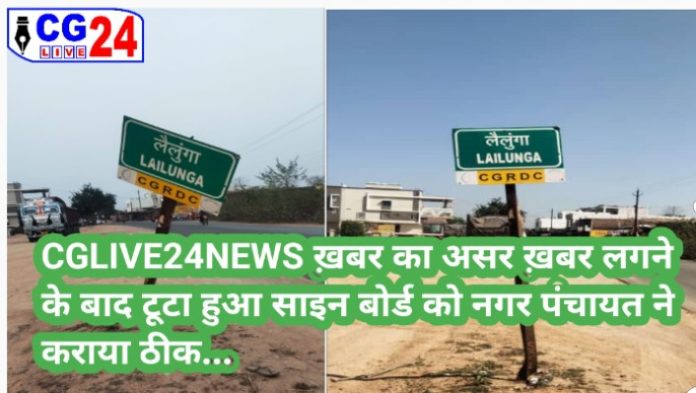 ख़बर का असर CGLIVE24NEWS पर ख़बर लगने से लैलूँगा नगर पंचायत की नींद खुली टूटा साइन बोर्ड को कराया गया ठीक….