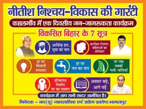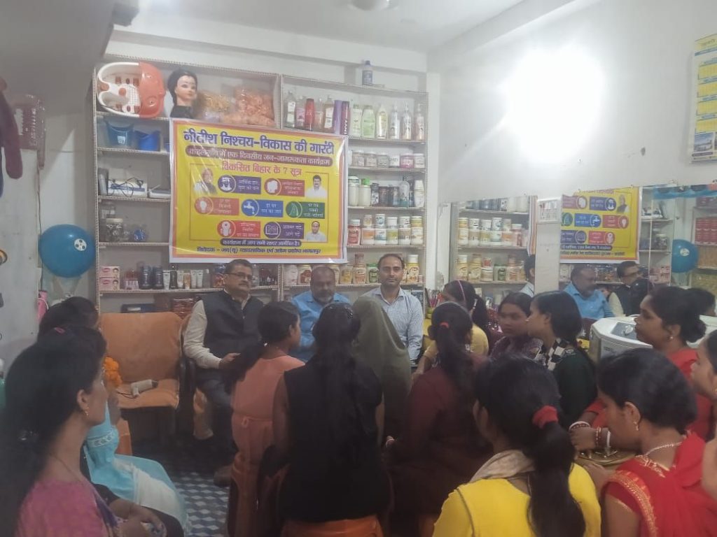 जदयू व्यावसायिक एवं उद्योग प्रकोष्ठ भागलपुर द्वारा जिला उपाध्यक्ष श्री कन्हैया खंडेलवाल के व्यवसायिक प्रतिष्ठान में नीतीश निश्चय विकास की गारंटी। जन जागरण अभियान माननीय मुख्यमंत्री श्री नीतीश कुमार द्वारा किया गया यह जन कल्याणकारी कार्य पर विस्तार से चर्चा हुआ। आज जदयू के कहलगाँव प्रखण्ड अध्यक्ष श्री राजीव कुमार सिंह की अध्यक्षता में आयोजित इस कार्यक्रम में कविता कुमारी मीनल कुमारी मिन्नत अंजली कुमारी सुरभी कुमारी रेशम कुमारी ईशा कुमारी, करिश्मा कुमारी सुनीता देवी निशा कुमारी प्राची कुमारी प्रयाग कुमार जगदीश महाराज गोविंद शर्मा मनीष कुमार जगमोहन शर्मा पट्टू शर्मा सहित आदि उपस्थित रहे। जिला उपाध्यक्ष श्री कन्हैया खंडेलवाल के कहा कि श्री नीतीश कुमार ने दानवीर भामाशाह की जयंती को राजकीय समारोह के रूप में मनाने एवं राजधानी पटना में उनकी आदमकद प्रतिमा को स्थापित करने का काम किया है। हमारे नेता ने सभी महापुरुषों को सम्मान दिया है और बिहार का पुराना गौरव लौटाया है। जिला अध्यक्ष दीपक कुमार गुप्ता ने 4,00,000 से अधिक सरकारी नौकरी देने के लिए, लाखों बहाली एवं नौकरियां प्रक्रियाधीन करने के लिए, देश में प्रथम बार जातिगत गणना कराने के लिए, 75% तक आरक्षण की सीमा बढ़ाने के लिए, नियोजित शिक्षकों को राज्यकर्मी का दर्जा देने के लिए, गुणवत्तापूर्ण शिक्षा की नींव रखने के लिए, स्वास्थ्य सेवा में सुधार के लिए, शहरों में वॉटर ड्रेनेज व्यवस्था कराने के लिए, सड़कों, पुलों, बाईपास एवं ग्रामीण सड़कों के निर्माण के लिए, खेलों में “मेडल लाओ, नौकरी पाओ’ योजना लागू करने के लिए, बिहार में प्रथम बार Tourism Policy, Sports Policy और IT policy लाने के लिए, विकास मित्र, टोला सेवक, शिक्षा मित्र का मानदेय बढ़ाने के लिए, विकास और निवेश के बड़े-बड़े प्रॉजेक्ट्स के लिए, पर्यटन बढ़ाने के लिए माननीय मुख्यमंत्री श्री नीतीश कुमार का आभार व्यक्त किया और कहा NDA की सरकार में सुपरफास्ट है बिहार के विकास की रफ्तार के लिए जानी जायेगी।