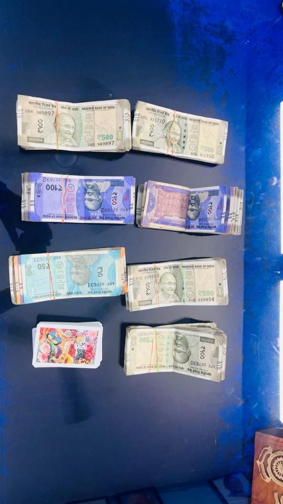 ● जुआ रेड में 04 जुआरियों से ₹2.46 लाख जप्त, जुआरियों पर जुआ एक्ट के साथ प्रतिबंधात्मक कार्रवाई…. *रायगढ़* । एसपी श्री दिव्यांग कुमार पटेल के दिशा निर्देशन पर जुआ-सट्टा, अवैध शराब पर जिले में ताबड़तोड़ कार्यवाही जारी है । एसपी रायगढ़ के निर्देशन पर जिले के नव पदस्थ नगर पुलिस अधीक्षक श्री आकाश शुक्ला द्वारा मुखबीरों को सक्रिय कर अवैध शराब और जुए पर कार्रवाई की जा रही है । इसी क्रम में आज दोपहर मुखबीर से मिली सूचना पर सीएसपी श्री आकाश शुक्ला के नेतृत्व में थाना चक्रधरनगर एवं साइबर सेल की संयुक्त टीम द्वारा ग्राम नवागांव में जुआ रेड कार्यवाही किया गया । मौके पर 04 व्यक्ति जुआ खेलते मिले, पुलिस की घेराबंदी देख एक व्यक्ति हीरो होंडा एक्टिवा से भागने लगा जिसे पुलिसकर्मियों ने दौड़ाकर पकड़ा । पकड़े गए चार जुआरियान- (1) जगनेश्वर साव पिता भारत लाल साव उम्र 50 साल निवासी वार्ड क्रमांक 6 चंद्रपुर जिला सक्ती (2) प्रकाश अग्रवाल पिता राजाराम अग्रवाल उम्र 38 साल निवासी गांधीगंज रायगढ़ (3) प्रदीप जायसवाल पिता स्वर्गीय जगदीश जायसवाल 60 साल पुरानी हटरी थाना कोतवाली (4) दयाराम अग्रवाल पिता रामकुमार अग्रवाल उम्र 65 साल दरोगा पर सिविल लाइन रायगढ़ के फड और पास से नगद *2,46,600 (दो लाख छियालीस हज़ार छः सौ रूपये )* और एक एक्टिवा स्कूटी की जप्ती की गई है । जुआरियों के विरुद्ध थाना चक्रधरनगर में जुआ एक्ट की कार्यवाही के साथ पृथक से प्रतिबंधात्मक धाराओं पर कार्यवाही किया गया है । जुआ रेड कार्यवाही में नगर पुलिस अधीक्षक श्री आकाश शुक्ला, थाना प्रभारी चक्रधरनगर निरीक्षक प्रशांत राव आहेर, सहायक उप निरीक्षक नंद कुमार सारथी, प्रधान आरक्षक महेंद्र कर्ष आरक्षक चूड़ामणि गुप्ता , नन्द कुमार पैकारा तथा साइबर सेल के प्रधान आरक्षक राजेश पटेल, दुर्गेश सिंह, आरक्षक प्रताप बेहरा, विकास प्रधान, शामिल थे ।