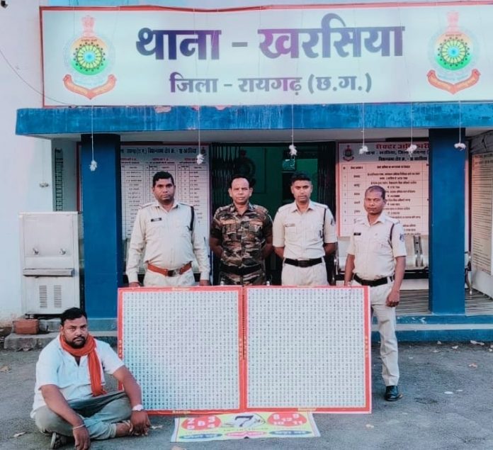 *09 मार्च, रायगढ़* । थाना खरसिया क्षेत्र अंतर्गत ग्राम बरगढ़ मेला में शांति व्यवस्था हेतु खरसिया पुलिस स्टाफ की ड्यूटी लगाई गई है । आज दोपहर मेला ड्यूटी में लगे खरसिया स्टाफ को मुखबीर से सूचना मिला कि मेला स्थल के आखरी छोर में एक व्यक्ति प्लाई बोर्ड पर तीर से निशाना लगवाने का रूपये पैसे का दांव लगवाकर “डांट” नामक जुआ खेला रहा है । तत्काल खरसिया पुलिस स्टाफ द्वारा जुआ खेला रहे व्यक्ति दयानंद साहू पिता गजालाल साहू उम्र 37 वर्ष निवासी नवापारा थाना मालखरौदा जिला सक्ती को पकड़ा जिससे दो नग प्लाई का बोर्ड, एक फ्लेक्सी, दो नग लोहे का तीर तथा नगदी रकम 700/ रूपये बरामद कर थाना लाया गया । आरोपित पर थाना खरसिया में धारा 6 छत्तीसगढ़ जुआ प्रतिषेध अधिनियम के तहत कार्रवाई किया गया है । जुआ रेड कार्रवाई में थाना खरसिया के सहायक उप निरीक्षक लक्ष्मी राठौर, आरक्षक विशोप सिंह और प्रदीप तिवारी शामिल थे ।