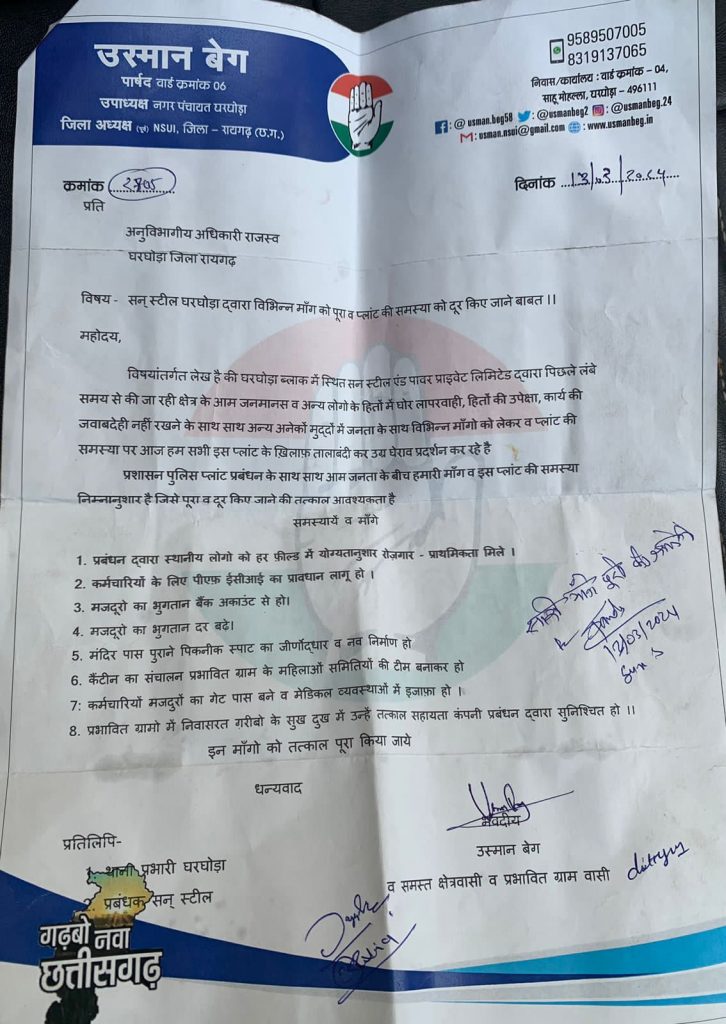 घरघोड़ा – घरघोड़ा के समीप सन स्टील के ख़िलाफ़ कुछ दिनों पूर्व क्षेत्र वाशियो ने लोकप्रिय जनप्रतिनिधि, नगर पंचायत उपाध्यक्ष घरघोड़ा उस्मान बेग के नेतृत्व में विभिन्न माँगो व समस्याओं को लेकर स्थानीय प्रशासन में एसडीएम राजस्व व पुलिस को अल्टीमेटम देते हुए माँगे न माने जाने के विरोध में प्लांट में तालाबंदी करने का फ़रमान जारी करते हुए उग्र आंदोलन करने का रुख़ अख़्तियार किया था ।
