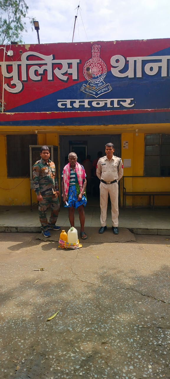 रायगढ़ पुलिस अधीक्षक श्री दिव्यांग कुमार पटेल के निर्देशन पर जिले में अवैध शराब पर लगातार कार्रवाई की जा रही है । इसी क्रम में थाना प्रभारी तमनार निरीक्षक आर्शीवाद राहटगांवकर के हमराह तमनार पुलिस की टीम द्वारा कल मुखबीर सूचना पर ग्राम टांगरघाट से केशरचुंवा जाने वाली मेन रोड पर एक व्यक्ति को पैदल बोरे से शराब लेकर जाते पकड़े । आरोपित ने पूछताछ में अपना नाम लक्ष्मी प्रसाद राठिया पिता स्वर्गीय केन्दाराम राठिया उम्र 57 वर्ष साकिन टांगरघाट थाना तमनार जिला रायगढ़ बताया जिसके पास से 15 लीटर महुआ (कीमती ₹3000) शराब जप्त किया गया है । आरोपी पर थाना तमनार में धारा 34(2), 59(क) आबकारी एक्ट के तहत कार्यवाही की गई है । शराब रेड कार्रवाई में प्रधान आरक्षक संतोष कुर्रे, महिला प्रधान आरक्षक उषारानी तिर्की, आरक्षक पुष्पेन्द्र कुमार तथा भीष्म देव सागर शामिल थे ।
