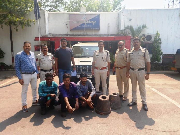 *24 मार्च, रायगढ़* । थाना भूपदेवपुर क्षेत्र अंतर्गत ग्राम नहरपाली स्थित जेएसडब्ल्यू कंपनी से कल दिनांक 23 मार्च की रात्रि तीन व्यक्ति प्लांट के ब्लास्ट फर्नीस के पास से 275 किलो कॉपर टूवर की चोरी कर अपने स्कॉर्पियो वाहन में लोड कर भाग रहे थे जिन्हें प्लांट के सुरक्षाकर्मियों ने पकड़ा और पुलिस को सूचना दी । तत्काल थाना प्रभारी भूपदेवपुर निरीक्षक रामकिंकर यादव हमराह स्टाफ के साथ मौके पर पहुंचे और आरोपी – (1) प्रकाश प्रधान पिता जगदीश प्रधान उम्र 31 साल निवासी इंदिरा निवास किरोड़ीमल नगर थाना कोतरारोड़ जिला रायगढ़ (2) रामकुमार अगरिया पिता सुकरू अगरिया उम्र 32 साल निवासी उच्चभिट्ठी थाना कोतरारोड़ जिला रायगढ़ (3) विनोद खलखो पिता समवेल खलखो उम्र 36 साल निवासी रेलवे कॉलोनी किरोड़ीमल नगर थाना कोतरारोड़ जिला रायगढ़ को हिरासत में लिया गया । चोरी को लेकर कंपनी के सुरक्षा अधिकारी के रिपोर्ट पर आरोपियों पर चोरी का अपराध 41/2024 धारा 380,34 आईपीसी पंजीबद्ध कर आरोपियों से विधिवत तीन नग कापर टूवर 275 किलो लगभग कीमती 1,65,000 रूपये एवं स्कार्पियों क्रमांक CG-13 A8503 वाहन की जप्त कर न्यायिक रिमांड पर भेजा गया है । आरोपियों की गिरफ्तारी एवं माल मशरूका बरामदगी कार्रवाई में निरीक्षक रामकिंकर यादव, प्रधान आरक्षक शंभू पाण्डेय, आरक्षक मुरली मनोहर पटेल, कृष्णा वारे, विजय पटेल, भुजबल जांगडे और मनोज यादव की विशेष भूमिका रही है ।