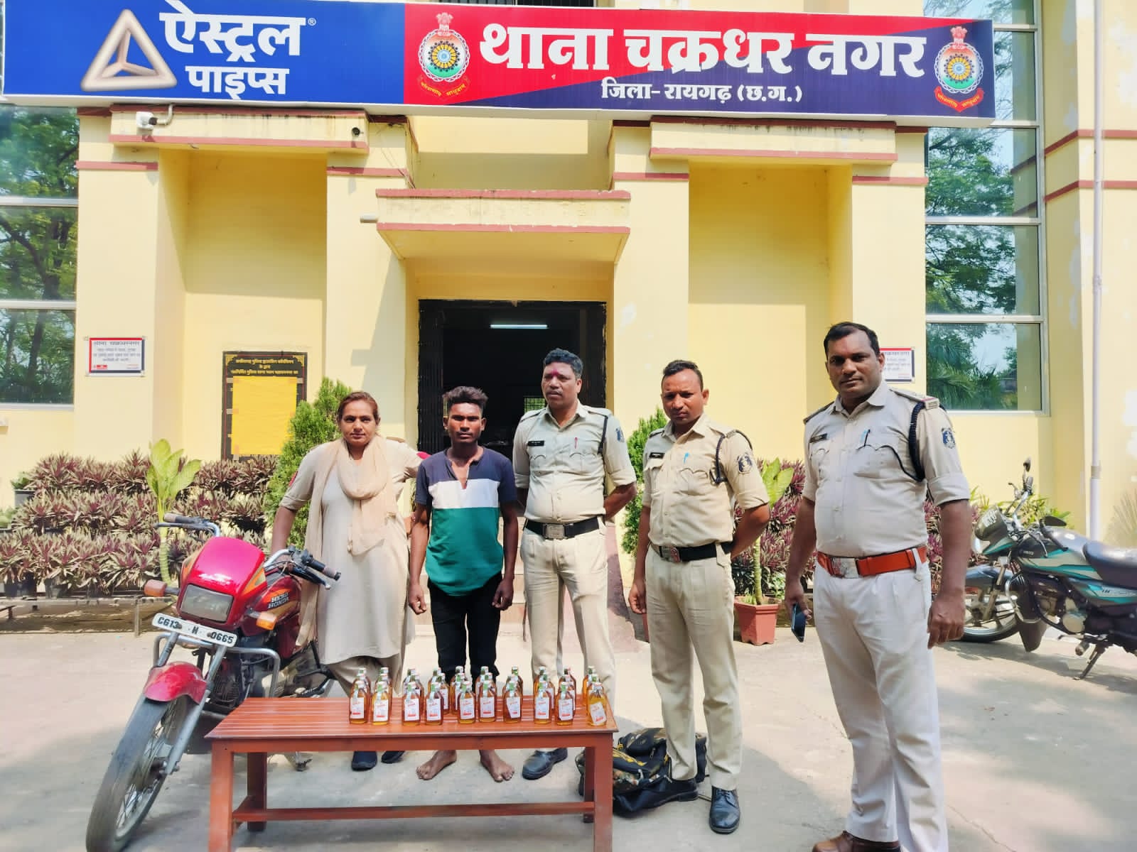 *25 मार्च रायगढ़* । कल रविवार होली की पूर्व संध्या पर कानून व्यवस्था ड्यूटी में लगे चक्रधरनगर पुलिस द्वारा रात्रि करीब 20.30 बजे शहीद हेमू कालाणी चौंक पर मोटर सायकल क्रमांक CG13M 0665 में अवैध बिक्री के लिये शराब लेकर आ रहे युवक अक्षय चौहान पिता मंगल चौहान उम्र 19 वर्ष ग्राम लाखा नया बस्ती थाना सीटी कोतवाली रायगढ़ को पकड़ा । अक्षय चौहान के कब्जे वाले काले रंग के पिट्ठू बैग अंदर 30 पाव गोवा अंग्रेजी शराब कुल शराब की मात्रा 5400ML (कीमत 3,600/- रूपये ) का बरामद हुआ जिसे जप्त कर आरोपी अक्षय चौहान पर थाना चक्रधरनगर में धारा 34(2),59(क)आबकारी एक्ट के तहत कार्यवाही किया गया है । शराब रेड कार्यवाही में थाना प्रभारी चक्रधरनगर निरीक्षक प्रशांत राव, महिला प्रधान आरक्षक विनिता कादयान, आरक्षक चन्द्र कुमार बंजारे और पेट्रोलिंग स्टाफ शामिल थे ।