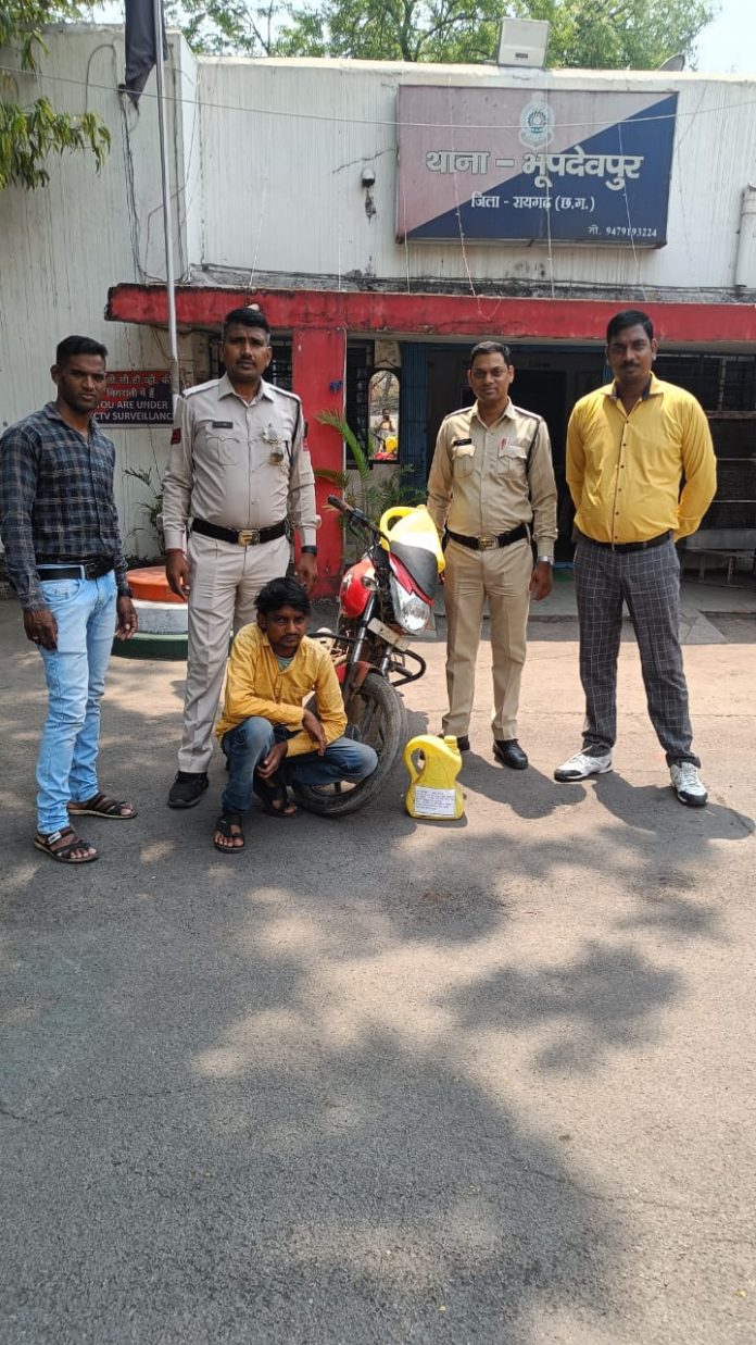 *28 मार्च, रायगढ़* । कल दिनांक 27/03/2024 को भूपदेवपुर पुलिस द्वारा ग्राम कांशीचुआ बस्ती चौक के पास मुखबीर सूचना पर बिना नम्बर मोटर सायकल सुजुकी हयाते पर शराब परिवहन कर रहे आरोपी दिनेश साहू पिता कंचन प्रसाद साहू (उम्र 35 वर्ष) साकिन कांशीचुआ थाना भूपदेवपुर जिला रायगढ़ को पकड़ा जिसके कब्जे से 09 लीटर महुआ शराब और अवैध परिवहन में प्रयुक्त मोटर सायकल की जप्ती की गई है।आरोपी दिनेश साहू के कृत्य पर थाना भूपदेवपुर में धारा 34(2),59(क) आबकारी एक्ट की कार्रवाई किया गया है । थाना प्रभारी भूपदेवपुर निरीक्षक रामकिंकर यादव के नेतृत्व पर शराब रेड कार्रवाई में प्रधान आरक्षक शंभू पाण्डेय, आरक्षक बोधराम सिदार, विजय कुमार पटेल, कृष्ण कुमार वारेन और महिला आरक्षक गौरी सिदार शामिल थे ।