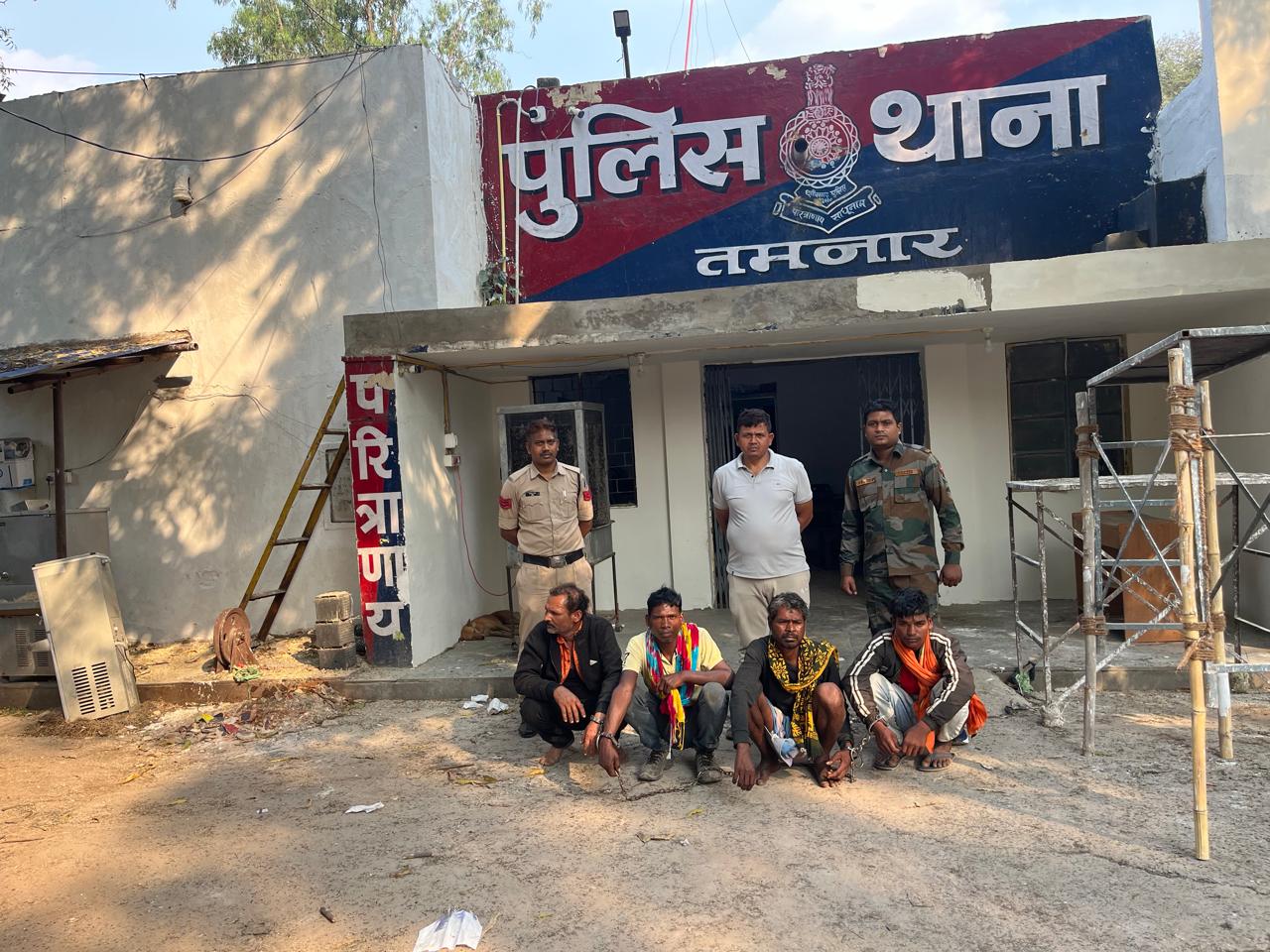 *15 अप्रैल रायगढ़* । कल दिनांक 14/04/2024 के रात्रि थाना प्रभारी तमनार निरीक्षक आशीर्वाद राहटगांवकर को सूचना मिला कि रोडोपाली से मुडागांव जाने वाले रास्ते में कुछ पशु तस्कर कृषक मवेशियों को क्रूरतापूर्वक मारते पीटते पैदल लेकर जा रहे हैं । तत्काल थाना प्रभारी अपने स्टाफ के साथ कार्रवाई के लिए ग्राम रोडोपाली पहुंचे । जहां गांव के सुरेन्द्र डेहरी ने बताया कि उन्होंने चार व्यक्तियों को मवेशियों को मारते पीटते लेकर जाते हुए रोका और सूचना दी है । मौके पर तमनार पुलिस ने चार पशु तस्कर आरोपी (1) मनोज यादव पिता शंख प्रसाद यादव उम्र 19 साल निवासी छर्राटांगर थाना पूंजीपथरा (2) बुद्धू राम एक्वा पिता बिहानू एक्का उम्र 44 साल निवासी नारायणपुर मुड़ापारा थाना लैलूंगा (3) रमेश कुमार मांझी पिता लक्ष्मण मांझी 31 साल नारायणपुर मुड़ापारा थाना लैलूंगा (4) गुरुदेव ध्रुव पिता शुभम ध्रुव उम्र 45 साल निवासी लपई थाना कांसाबेल जिला जशुपुर के कब्जे से 45 नग कषिधन मवेशियों को पुलिस कब्जे में लेकर उनके चारा पानी की व्यवस्था की गई । प्रार्थी सुरेंद्र डेहरी के रिपोर्ट पर आरोपियों के विरुद्ध थाना तमनार में अपराध क्रमांक 123/2024 धारा 4, 6, 10, 11 छत्तीसगढ़ कृषक पशु परिरक्षण अधिनियम 2004 के तहत कार्यवाही कर न्यायिक रिमांड पर भेजा गया है । थाना प्रभारी तमनार निरीक्षक आशीर्वाद राहटगांवकर के निर्देशन पर कार्यवाही में सहायक उप निरीक्षक खेमराज पटेल, प्रधान आरक्षक देव प्रसाद राठिया, आरक्षक भीष्मदेव सागर, पुरुषोत्तम सिदार और अनुप मिंज शामिल थे ।