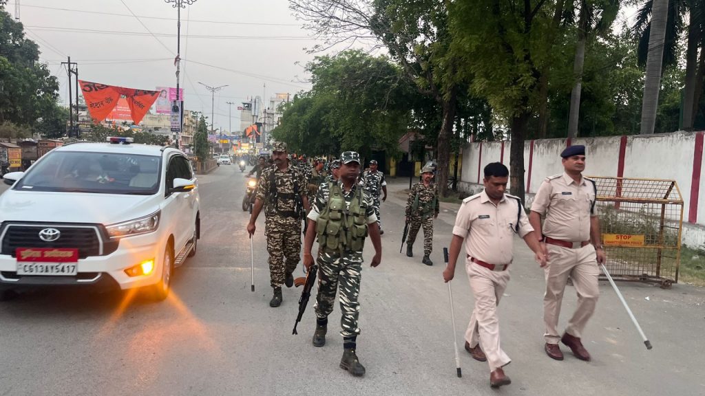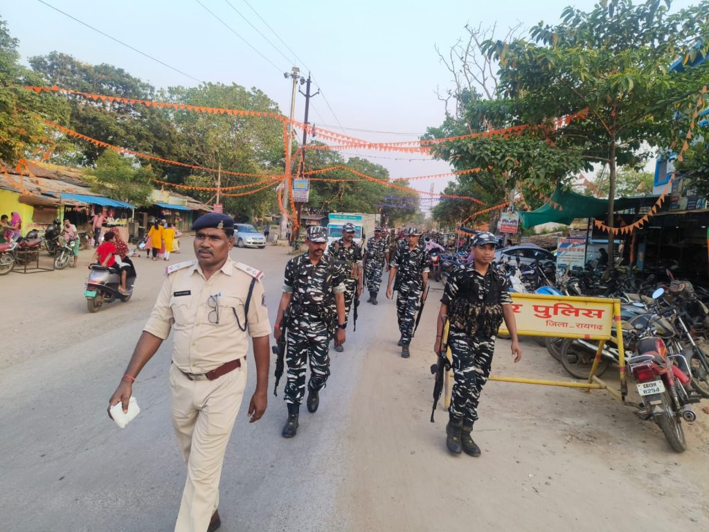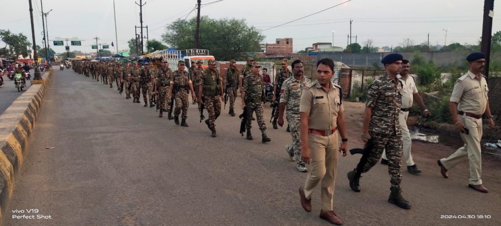● रायगढ़ पुलिस ने नागरिकों को भय मुक्त होकर 07 मई को अधिक से अधिक मतदान करने का दिया संदेश– *30 अप्रैल रायगढ़* । लोकसभा चुनाव 2024 के तीसरे चरण में 07 मई को जिले में मतदान होना है । चुनाव कार्य के लिए जिले में अर्द्धसैनिक बलों की कंपनियों के आने का सिलसिला जारी है जिनके ठहरने हेतु अलग-अलग थानाक्षेत्र में व्यवस्था की गई है । कलेक्टर श्री कार्तिकेया गोयल एवं पुलिस अधीक्षक श्री दिव्यांग कुमार पटेल के दिशा-निर्देशन पर आज जिले के सभी थानाक्षेत्र अंतर्गत राजपत्रित पुलिस अधिकारियों व थाना/चौकी प्रभारियों ने अर्धसैनिक बल के जवानों ने साथ शहरी व ग्रामीण क्षेत्रों में पैदल फ्लैग मार्च निकाला गया। पुलिस अधिकारियों ने फ्लैग मार्च दौरान नागरिकों को भय मुक्त होकर मतदान दिवस 07 मई को अधिक से अधिक मतदान करने का संदेश दिया गया । जिला मुख्यालय में पुलिस अधीक्षक श्री दिव्यांग कुमार पटेल की अगुवाई में शहर के प्रमुख चौंक-चौराहों पर सुरक्षा बलों ने फ्लैग मार्च किया । फ्लैग मार्च का मुख्य उद्देश्य जिले के नागरिकों को सुरक्षा का बोध कराना एवं असामाजिक तत्वों तक संदेश पहुंचाना है कि शांति व्यवस्था को प्रभावित करने की हिमाकत न करें । जिले में शांतिपूर्ण चुनाव सम्पन्न कराने जिला प्रशासन, पुलिस व पैरामिलिट्री फोर्स पूर्ण रूप से प्रतिबद्ध व तत्पर है।