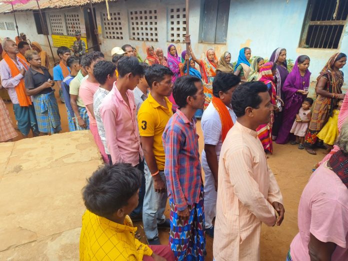 ग्रामीणों के साथ वोट डालने लगे कतार में राधेश्याम राठिया उनकी माता तिल कुंवर, धर्म पत्नी निद्रावती , भाभी हेमवती
