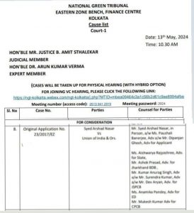 साहिबगंज।जिले के चर्चित सामाजिक कार्यकर्ता सह पर्यावरण प्रेमी सैयद अरशद नसर द्वारा जिला के ऐतिहासिक राजमहल पहाड़ के संरक्षण व संवर्धन हेतु व जिले में अवैध रूप से संचालित सभी स्टोन माईंस व क्रशर को संपुर्ण रूप से बंद कराने को लेकर एनजीटी ईस्टर्न जोन कोलकाता में माह जनवरी 2017 में दायर याचिका संख्या-23/2017 की आज पीठ के जुडिशियल मेंबर जस्टिस बी.अमित स्थालेकर व एक्स्पर्ट मेंबर डा.अरूण कुमार वर्मा दिन के 10:30 बजे से सुनवाई करेंगे.प्रवर्तन निदेशालय (ईडी) के द्वारा दाखिल जवाबी हलफनामा के बाद एनजीटी में आज पहली सुनवाई है.बताते चले की ईडी द्वारा एनजीटी में दाखिल हलफनामा में जिले में एक हज़ार करोड़ रूपया से अधिक का अवैध खनन का पुष्टि करते हुए इसका किंगपिन सुबे के पुर्व मुख्यमंत्री हेमंत सोरेन के विधायक प्रतिनिधि पंकज मिश्रा को बताते हुए जांच जारी रहने की बात कही है.फिलहाल पंकज मिश्रा लंबी अवधि से रांची के होटवार जेल में बंद हैं.सुनवाई में भाग लेने के लिए अरशद नसर भी कोलकाता पहुँच गए है.आज की सुनवाई के चलते पुलिस प्रशासनिक पदाधिकारियों समेत पत्थर माफियाओं की दिल की धड़कने तेज़ हो गई है.आज की सुनवाई पर सभी लोग नजरें गड़ा दिए है.