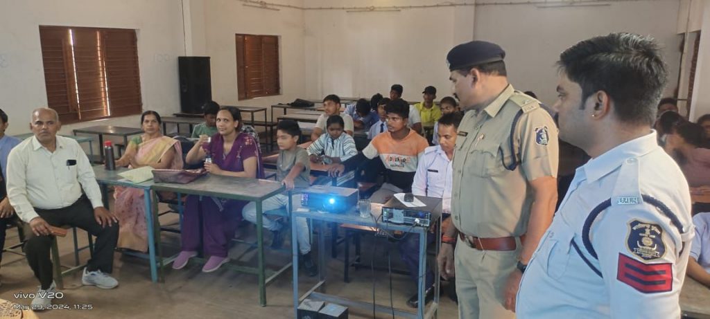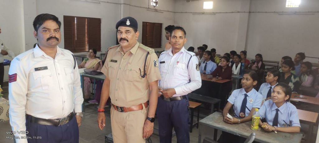 *29 मई रायगढ़* । यातायात नियमों के प्रति जागरूकता को लेकर एसपी श्री दिव्यांग कुमार पटेल के दिशा निर्देशन एवं ट्रैफिक डीएसपी रमेश कुमार चन्द्रा के मार्गदर्शन पर आज ट्रैफिक थाने की टीम द्वारा समर सेशन में शामिल हुए स्वामी आत्मानंद शासकीय उच्चतर माध्यमिक विद्यालय किरोड़ीमल नगर तथा स्वामी आत्मानंद शासकीय उच्चतर माध्यमिक विद्यालय चक्रधरनगर के छात्र-छात्राओं और अध्यापकों को यातायात नियमों की जानकारी देकर बच्चों को यातायात नियमों से संबंधित रोचक लघु फिल्में दिखाया गया । एएसआई राजेन्द्र पटेल एवं हेड कांस्टेबल मुकेश चौहान ने स्कूली बच्चों को जेब्रा क्रासिंग, स्टॉप लाइन, लाल बत्ती जैसे संकेतों के बारे में जानकारी देते हुए जेब्रा क्रासिंग सब-वे या फुट ओवरब्रिज से ही सड़क पार करने बताया गया । बच्चों को उनके पैरेंट्स को दोपहिया चलाते समय हेलमेट और कार चलते समय सीट बेल्ट लगाने की अनिवार्यता बताई गई और तेज गति व वाहन चलाते समय मोबाइल के उपयोग से होने वाली दुर्घटनाओं को बताया गया । बच्चों को उनके स्वजनों से यातायात नियमों का पालन कराने प्रेरित किया गया । कार्यक्रम में एएसआई राजेन्द्र पटेल और हेड कांस्टेबल मुकेश चौहान के साथ कांस्टेबल विजय सिदार और झशपाल शर्मा भी मौजूद थे ।