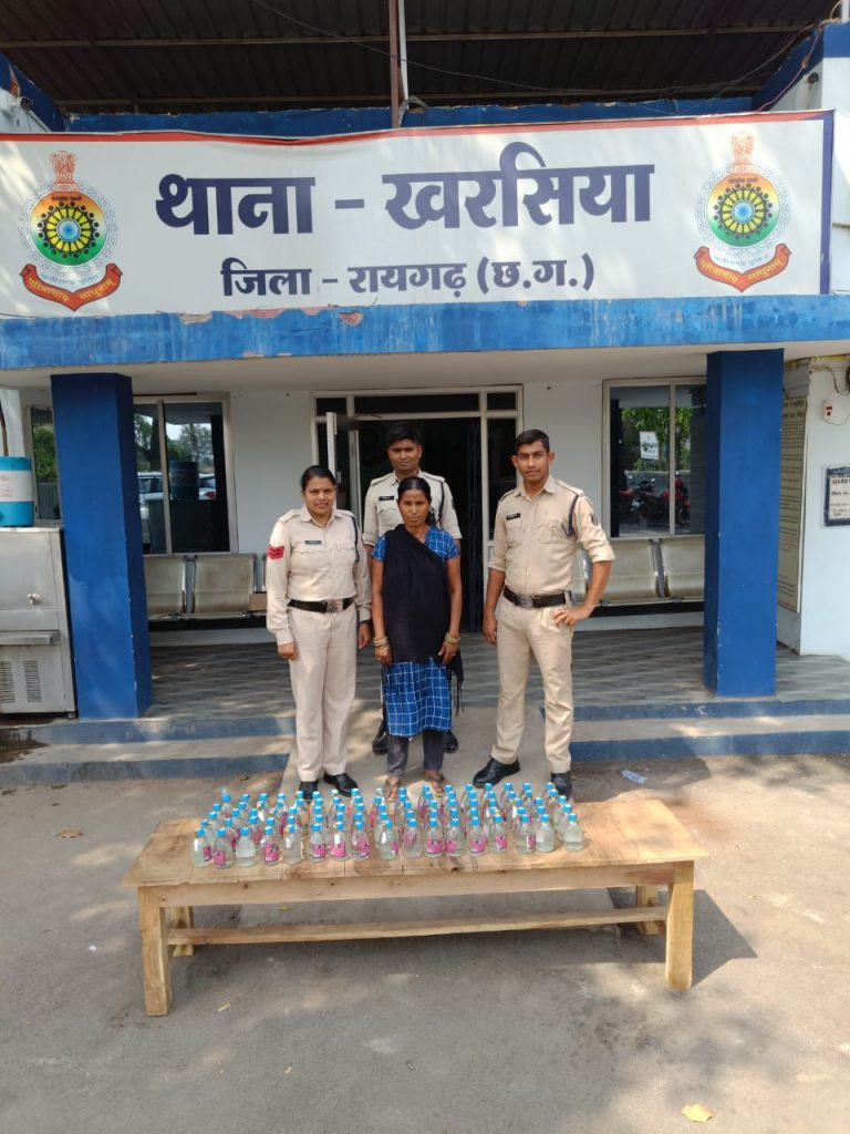 *02 जून, रायगढ़* । खरसिया थानाक्षेत्र में प्रशिक्षु आईपीएस एवं थाना प्रभारी खरसिया श्री आकाश श्रीश्रीमाल के नेतृत्व में अवैध शराब, जुआ सट्टा पर अंकुश लगाने अभियान स्तर पर पुलिस की कार्यवाही जारी है । इसी क्रम में कल 01 जून को प्रशिक्षु आईपीएस श्री आकाश श्रीश्रीमाल के नेतृत्व में खरसिया पुलिस की टीम द्वारा अवैध शराब बिक्री सूचना पर कार्यवाही किया गया । प्रशिक्षु आईपीएस आकाश श्रीश्रीमाल को मुखबिर से सूचना प्राप्त हुई कि ग्राम छोटे देवगांव के *अनसूईयागुप्ता उर्फ गुड्डी गुप्ता (उम्र 50 वर्ष)* अपने घर काफी अधिक मात्रा में शराब रखकर अवैध रूप से बिक्री किया जाता है । सूचना पर तत्काल खरसिया पुलिस की टीम द्वारा मुखबीर के बताए स्थान पर रेड कार्यवाही किया गया । महिला के घर दुकान के अंदर प्लास्टिक बोरी पर छिपा कर रखा हुआ 85 पाव देसी प्लेन मदिरा बरामद हुआ। आरोपिया के विरुद्ध थाना खरसिया मे अपराध क्रमांक 339/2024 धारा 34(2),59(1) आबकारी अधिनियम तहत कार्यवाही किया गया है । कार्यवाही में उपनिरीक्षक ऐनु कुमार देवांगन, सहायक उप निरीक्षक राजेश कुमार दर्शन आरक्षक हेमलाल सिदार और योगेन्द्र सिदार शामिल थे ।