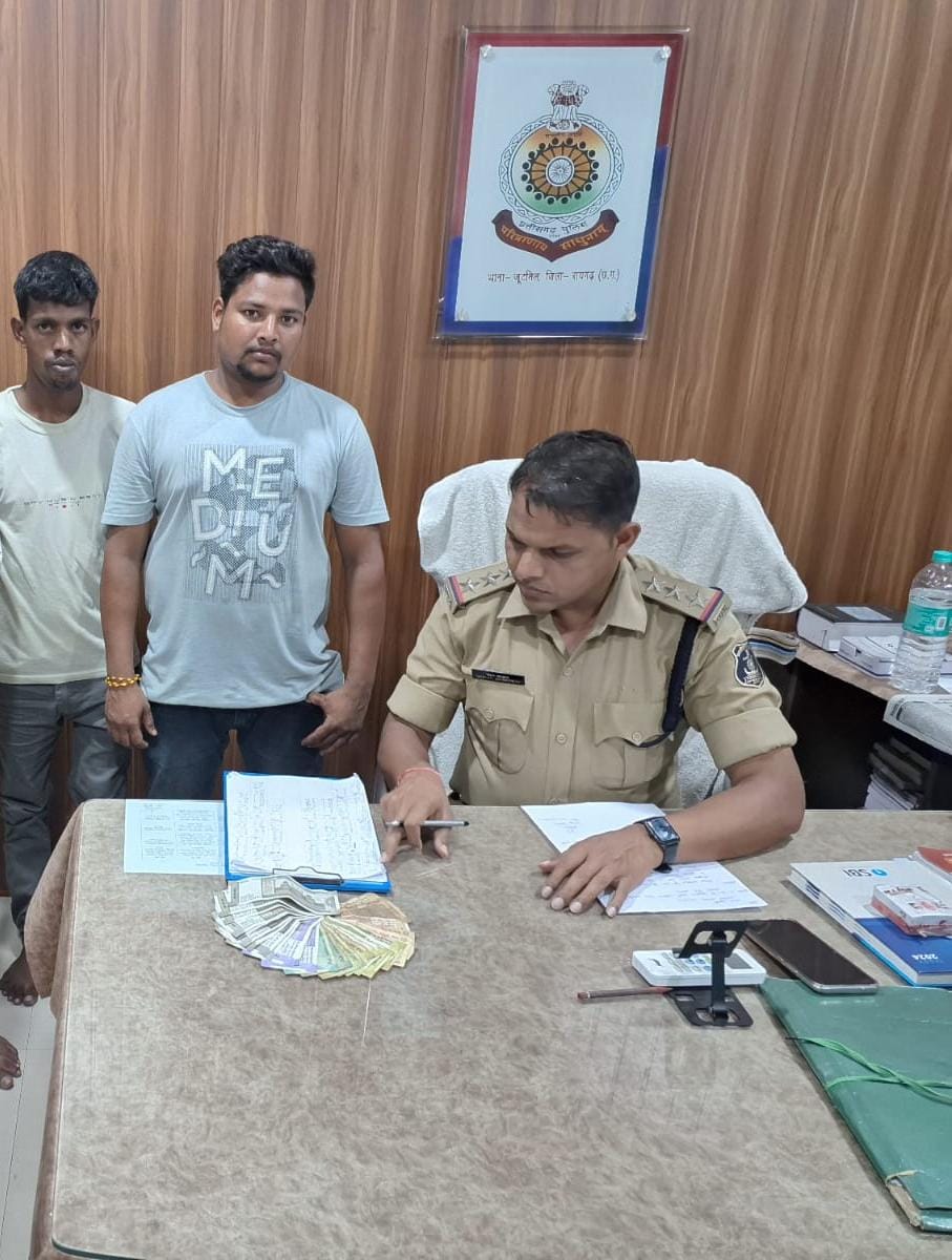 *04 जून, रायगढ़* । कल शाम थाना प्रभारी जूटमिल निरीक्षक मोहन भारद्वाज को मुखबीर से सूचना मिली कि कबीर चौक बीमा अस्पताल के पास भुवन आदित्य नामक व्यक्ति तथा सहाबुद्दीन खान नामक व्यक्ति द्वारा सट्टा-पट्टी लिखा जा रहा है । थाना प्रभारी द्वारा तत्काल थाने से कार्रवाई के स्टाफ कबीर चौंक रवाना किया गया । जहां जूटमिल पुलिस द्वारा कबीर चौक बीमा अस्पताल के पास *भुवन आदित्य पिता कन्हैया आदित्य उम्र 25 वर्ष निवासी बाजीनपाली शिव नगर थाना जूटमिल रायगढ़* को सट्टा लिखते पकड़ा गया जिसके कब्जे से नगदी रकम ₹2120/- रूपये, एक सफेद कागज में विभिन्न अंको में लिखा सट्टा-पट्टी, पेन की जप्ती की गई है । वहीं कबीर चौंक के पास एक अन्य रेड कार्रवाई में पुलिस ने *सहाबुद्दीन खान पिता सहनुद्दीन खान उम्र 35 वर्ष निवासी गांधी नगर वार्ड क्र. 33, थाना जूटमिल रायगढ़* को सट्टा-पट्टी लिखते पकड़ा गया है जिसके कब्जे नगदी रकम 1460/- रूपये, एक पेन और सट्टा पट्टी की जप्ती की गई है । दोनों आरोपियों पर थाना जूटमिल में क्रमशः अप.क्र. 257, 258/2024 धारा 06 (क) छत्तीसगढ़ जुआ प्रतिषेध अधिनियम 2022 के तहत कार्रवाई किया गया है । रेड कार्रवाई में थाना जूटमिल के एसआई अमृत लाल साहू, एएसआई राजेन्द्र पटेल एवं हमराह पेट्रोलिंग आरक्षक लखेश्वर पुरसेठ और शशिभूषण साहू शामिल थे ।