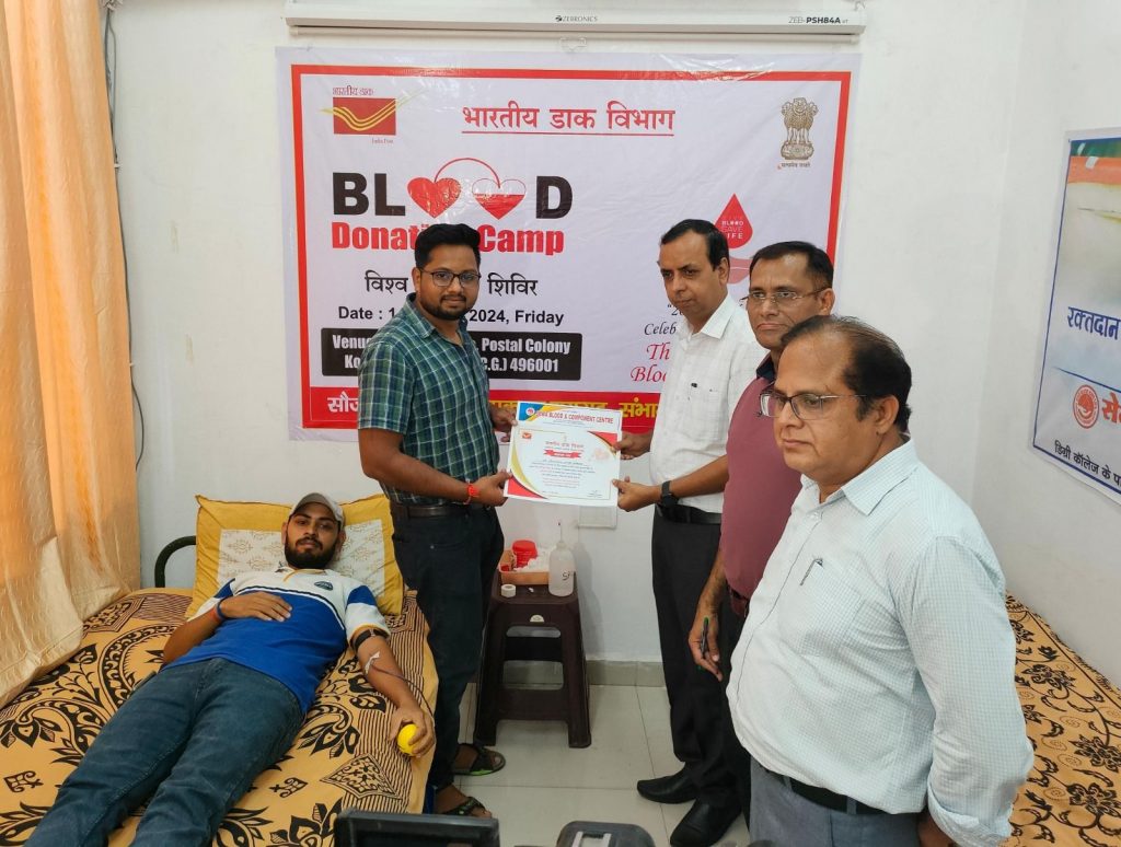 विश्व रक्तदान के दिवस पर कार्यालय अधीक्षक डाकघर, रायगढ़ द्वारा संभागीय कार्यालय कोतरा रोड, रायगढ़ में सेवा ब्लड बैंक एवं चिकित्सक टीम रायगढ़ के सहयोग से रक्तदान शिविर का आयोजन किया गया। कार्यक्रम का शुभारंभ श्री नरेन्द्र कुमार राजपाल अधीक्षक डाकघर रायगढ़ संभाग द्वारा किया गया। इस दौरान श्री छबिलाल पटेल, श्री सुमन एक्का, श्री मोहम्मद नियाजुद्दीन, श्री रमेश कुमार देवांगन तथा संभागीय कार्यालय व प्रधान डाकघर रायगढ़ के कर्मचारीगणों ने रक्तदान किया। इस दौरान सभी रक्तदाताओं का आभार व्यक्त किया गया एवं उनके उज्जवल भविष्य की शुभकामनाएं दी गई। कार्यक्रम में डाक सुविधा का लाभ लेने के लिए पहुंचे ग्राहकों को भी जागरूक किया गया।