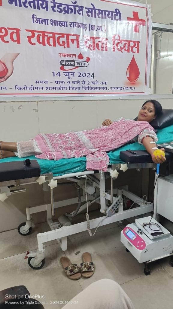 रायगढ़, 14 जून 2024/ विश्व रक्तदान दिवस के अवसर पर आज जिला अस्पताल एवं विकासखंड खरसिया में विश्व रक्तदान दिवस का आयोजन प्रात: 9 बजे से सायं 5 बजे तक किया गया। जिसमें इच्छुक व्यक्तियों ने जिला चिकित्सालय के ब्लड बैंक में आकर स्वेच्छा से अपना रक्तदान किये। ब्लड बंैक में रखे यह रक्त गर्भवती महिला, बच्चे, वृद्ध व्यक्ति जैसे जरूरतमंद लोगों के जीवन में काम आएगा।