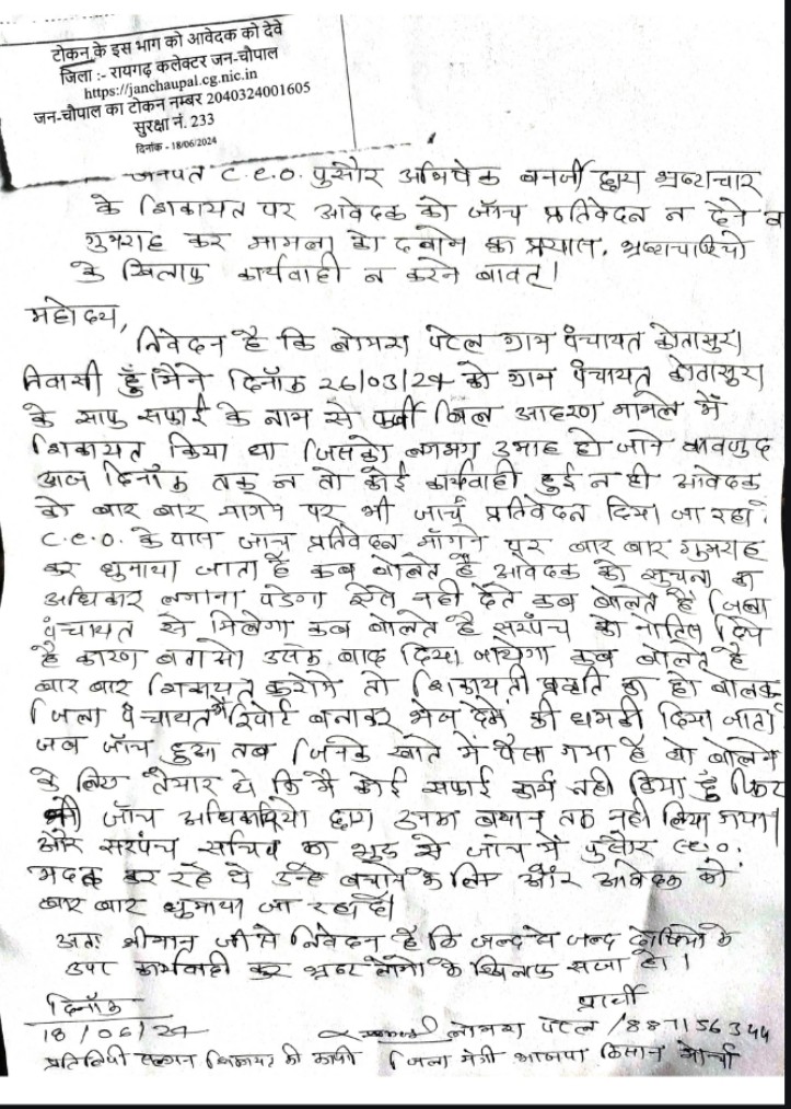 रायगढ़/ जिला कलेक्टर के जनदर्शन में आवेदक ने अपनी शिकायत में उल्लेख किया है कि मै लोमेश पटेल ग्राम पंचायत कोतासुर का निवासी हुँ, मैने दिनांक 26/03/24 को ग्राम पंचायत कोतासुरा के साफ सफाई के नाम से फर्जी बिल आहरण मामले में शिकायत किया था जिसको लगभग तीन माह हो जाने के बावजूद आज दिनांक तक ना तो कोई कार्यवाही हुई नहीं आवेदक को सीईओ के पास जाने पर प्रतिवेदन मांगने पर बार-बार गुमराह कर घुमाया जाता है कब बोलते हैं आवेदक को सूचना का अधिकार लगाना पड़ेगा ऐसे नहीं देते कब बोलते हैं जिला पंचायत से मिलेगा कल बोलते हैं सरपंच को नोटिस दिए हैं कारण बताओ उसके बाद दिया जाएगा कब बोलते हैं बार-बार शिकायत करोगे तो शिकायती प्रवृत्ति का हो बोलकर जिला पंचायत में रिपोर्ट बनाकर भेज देंगे की धमकी दिया जाता है। जब जांच हुआ तब जिनके खाते में पैसा गया है वह बोलने के लिए तैयार थे कि मैं कोई सफाई कार्य नहीं किया हूं फिर जांच अधिकारी उनका बयान तक नहीं लिया गया और सरपंच सचिव का खुद से जांच प्रतिवेदन में सीईओ बचाने के लिए और उनको मदद कर रहे,आवेदक को बार-बार घुमाया जा रहा है।