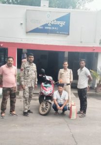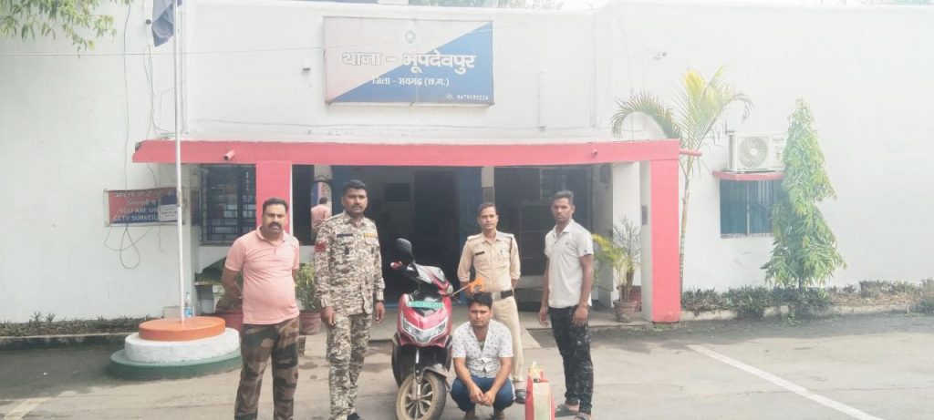 ● स्कूटी पर शराब परिवहन कर रहे युवक को भूपदेवपुर पुलिस ने पकड़ा, आरोपी से 10 लीटर महुआ शराब और इलेक्ट्रानिक स्कूटी जप्त….. *21 जून, रायगढ़* । आज दिनांक 21.06.2024 को मुखबीर सूचना पर भूपदेवपुर पुलिस की पेट्रालिंग द्वारा ग्राम किरीतमाल एनएच-49 पर घेराबंदी कर इलेक्ट्रानिक स्कूटी पर महुआ शराब की तस्करी कर रहे युवक को पकड़ा गया है । जानकारी के मुताबिक आज सुबह थाना प्रभारी भूपदेवपुर निरीक्षक रामकिंकर यादव को मुखबीर से सूचना मिला कि एक व्यक्ति महुआ शराब अवैध बिक्री के लिये इलेक्ट्रानिक स्कूटी पर लेकर ग्राम किरीतमाल की ओर आ रहा है । थाना प्रभारी द्वारा पेट्रोलिंग स्टाफ को तत्काल किरीतमाल पहुंचकर कार्रवाई करने निर्देशित किया गया । थाना भूपदेवपुर की पेट्रोलिंग द्वारा ग्राम किरीतमाल एनएच-49 के समीप घेराबंदी कर संदेही स्कूटी चालक को शराब तस्करी करते पकड़ा गया । संदेही अपना नाम *डिगाम्बर साहू पति गजानंद साहू उम्र 31 वर्ष साकिन किरीतमाल थाना भूपदेवपुर जिला रायगढ़* बताया जिसके कब्जे से दो-दो लीटर क्षमता वाले पांच कोल्डड्रिंक बॉटल में भरा कुल 10 लीटर महुआ शराब पाया गया जिसे डिगाम्बर साहू द्वारा अवैध बिक्री के लिए परिवहन करना बताया । आरोपी डिगाम्बर साहू से *10 लीटर अवैध महुआ शराब कीमती ₹1,000 रूपये* तथा एक लाल रंग की इलेक्ट्रानिक स्कूटी क्रमांक CG-13 AS-4533 कीमती ₹70,000 *कुल जुमला किमती ₹71,000* का जप्त कर आरोपी पर थाना भूपदेवपुर में अप.क्र. 65/2024 धारा 34(2),59(क) आबकारी एक्ट के तहत कार्यवाही किया गया है । जप्त इलेक्ट्रानिक स्कूटी को पुलिस राजसात की कार्यवाही के लिए प्रतिवेदन जिला दंडाधिकारी को प्रेषित किया जावेगा । शराब रेड कार्रवाई में थाना भूपदेवपुर के प्रधान आरक्षक शंभू पाण्डेय, आरक्षक मुरली पटेल, बोधराम सिदार और विजय पटेल शामिल थे ।
