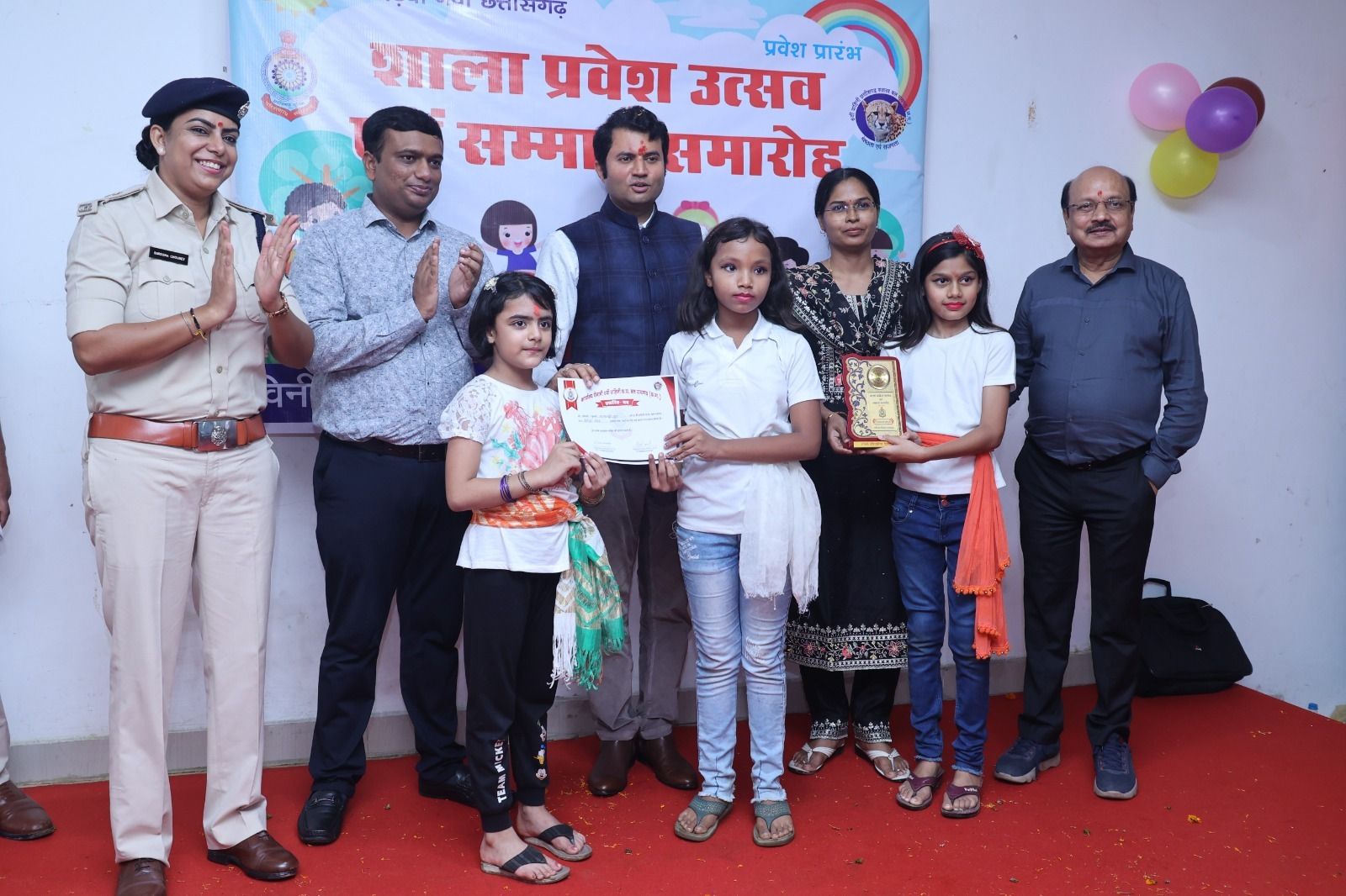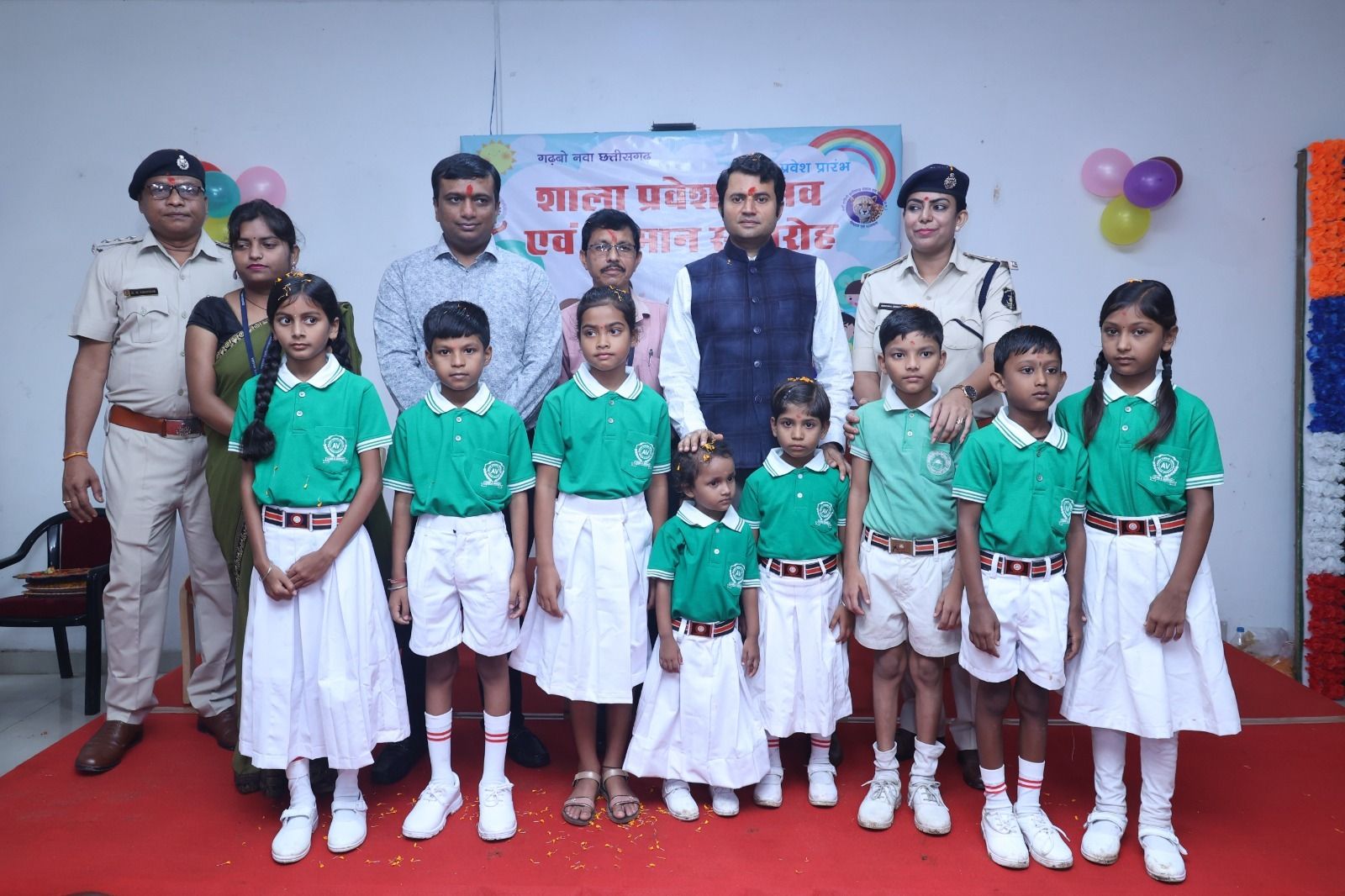 रायगढ़, 3 जुलाई 2024/ कलेक्टर श्री कार्तिकेया गोयल के मुख्य आतिथ्य में आज 6वीं वाहिनी छत्तीसगढ़ सशस्त्र बल उर्दना, रायगढ़ के आदर्श वंदना विद्यालय में शाला प्रवेश उत्सव एवं सम्मान समारोह का आयोजन किया गया। जिसमें विशिष्ट अतिथि के रूप में एसपी श्री दिव्यांग पटेल उपस्थित रहे। इस दौरान कलेक्टर श्री कार्तिकेया गोयल एवं एसपी श्री दिव्यांग पटेल ने नन्हे नव प्रवेशी बच्चों को तिलक लगाकर स्वागत किया।