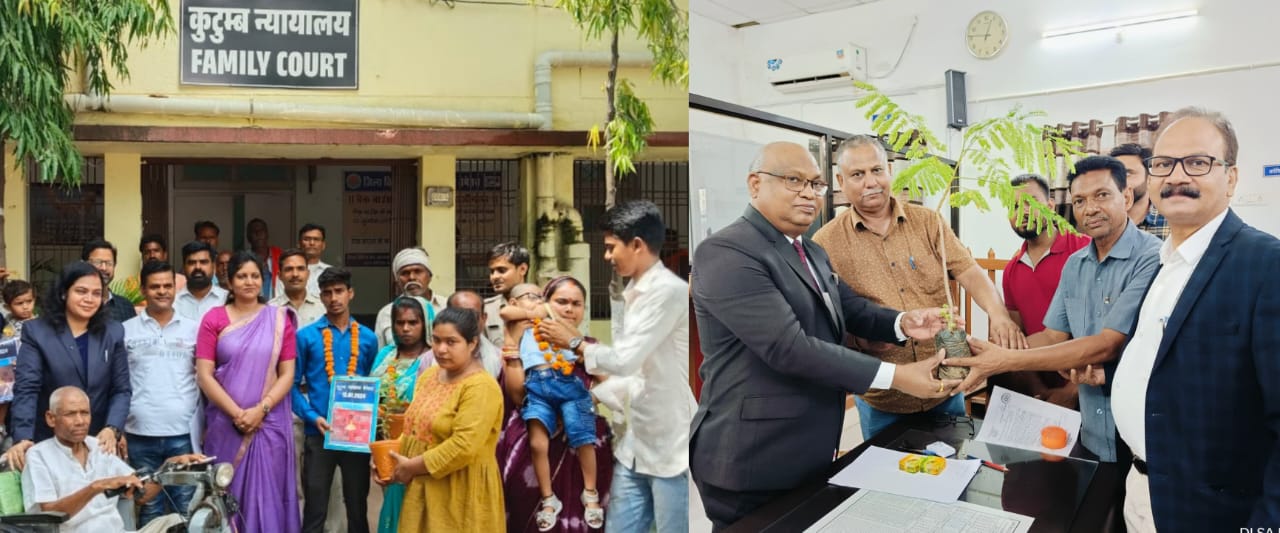 लम्बे समय से मामूली झगड़े के चलते अलग-अलग निवासरत् पति-पत्नि न्यायाधीश, कुटुम्ब न्यायालय श्रीमती नीलिमा सिंह बघेल की समझाईश पश्चात् हुए एक। न्यायाधीश द्वारा पक्षकारों को नारियल, तुलसी पौधा व सप्तत्रापि सात वचन की प्रतिलिपि भेंट दी गई। अन्य प्रकरण में पति द्वारा 02 वर्ष की बच्ची सहित 07 माह की गर्भवती आवेदिका को बेसहारा छोड़ा था, कुटुम्ब न्यायालय न्यायाधीश द्वारा दी गई समझाईश पश्चात् 10 हजार प्रतिमाह भरण-पोषण का हुआ आदेश। अन्य प्रकरण में एक दिव्यांग बुजुर्ग को उसके बेटे द्वारा घर से निकाले जाने पर लंबित भरण पोषण प्रकरण में न्यायाधीश श्रीमती नीलिमा सिंह बघेल की समझाईश पर परिजन घर ले जाने को हुए तैयार परिवार परिजन को मिठाई खिलाकर हंसी-खुशी घर भेजा गया।