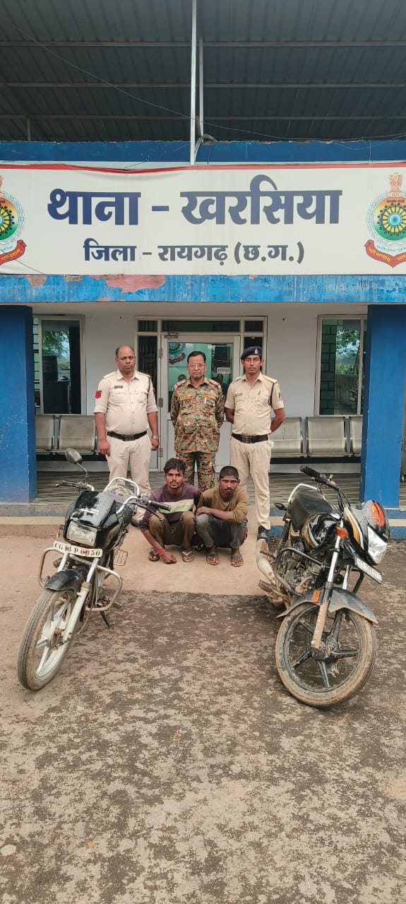 गंभीर वारदात की सूचना पर पुलिस अधीक्षक द्वारा शीघ्र अधिकारियों को माल मुल्जिम पतासाजी का निर्देश दिए। थाना प्रभारी खरसिया कुमार गौरव साहू एवं हमराह स्टाफ द्वारा पीड़ित के बताए हुलिए की जानकारी लेकर मुखबीरों को आरोपियों की सूचना देने लगाया गया । शीघ्र संदेही योगेश पटेल और होरीलाल सिदार निवासी खुर्सीपाली बोतल्दा को हिरासत में लिया गया जिनसे लूटपाट के संबंध में कड़ी पूछताछ करने पर लूटपाट करना स्वीकार किया है । *आरोपी योगेश पटैल पिता दिलचंद पटैल 22 साल और होरीलाल सिदार पिता फुलसिंह सिदार 27 साल दोनों निवासी ग्राम खुर्सीपाली बोतल्दा थाना खरसिया* के मेमोरेंडम पर दिलीप मार्को से लूटी मोटरसाइकिल स्प्लेंडर प्लस बाइक CG 13 P 0950 एवं ₹2000 तथा आरोपियों द्वारा मोटर घटना में प्रयुक्त की होंडा साइन मोटरसाइकिल सीजी 13 ए.एक्स.- 5517 *कुल-₹92,000* की मशरूका की जप्ती की गई है । आरोपियों को आज शाम गिरफ्तार का न्यायिक रिमांड पर भेजा गया है ।