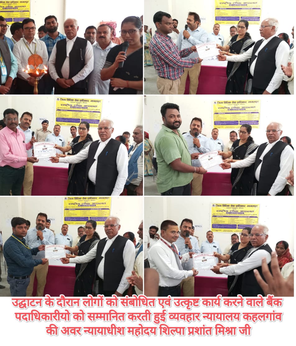 कहलगांव में 13 जुलाई को आयोजित हुई राष्ट्रीय लोक अदालत में कुल 1 करोड़ 23 लाख 53 हजार 515 रूपयें की राशि पर समझौता हुआ और 88 लाख 37 हजार 512 रुपये की राशि की वसूली हुई जिसमें भारतीय स्टेट बैंक के 64, यूको बैंक 151, ग्रामीण बैंक 9, यूनियन बैंक 46, इंडियन बैंक 01, इंडियन ओवरसीज बैंक 01, बैंक ऑफ बरोंदा 01, बीएसएनएल 07 सहित कुल 361 मामलों का निपटारा आपसी सहमति से किया गया. पूर्व निर्धारित कार्यक्रम के अनुसार आज व्यवहार न्यायालय परिसर, कहलगाँव में आयोजित वर्ष के दूसरे लोक अदालत काफी सफल रहा. विदित हो की विगत 2 माह से आज के लोक अदालत की तैयारी की जा रही थी और समिति के द्वारा प्रचार प्रसार के साथ साथ कुल 7800 से अधिक नोटिस का तमिलों थाना और पारा लीगल वालंटियर के द्वारा करवाया गया था. आज सर्वप्रथम दीप प्रज्ज्वलित करते हुए प्राधिकार की अध्यक्ष अवर न्यायाधीश श्रीमती शिल्पा प्रशांत मिश्रा जी, अधिवक्ता सदस्य श्री जय शंकर सिंह के द्वारा कार्यक्रम की विधिवत शुरूवात की गई l, अध्यक्ष सह अवर न्यायाधीश श्रीमती शिल्पा प्रशांत मिश्रा ने अपने उद्घाटन भाषण में बैंकरों से मामलें के निष्पादन में लचीला रुख अपनाते हुए अधिक से अधिक मामलों में निष्पादन हेतु सहयोग की अपील की. उनके द्वारा बेहतर काम करने वाले 5 बैंकरों को जिन्होंने सांकेतिक राशि पर समझोता करते हुए जन सेवा का कार्य किया को प्रशस्ति पत्र देकर सम्मानित भी किया गया. इस अवसर पर प्राधिकार के मनीष पांडे के अलावा वरीय सहायक चंदन चौधरी, नाजिर अरविंद कुमार, बेंच क्लर्क प्रवीण रजक, संदीप कुमार. श्रीओम शरण, प्रदीप कुमार. के अलावे पी एल वी सुभाष कुमार, रामजी पांडे, ऋषिकेश तिवारी और अविकास मौजूद थे .