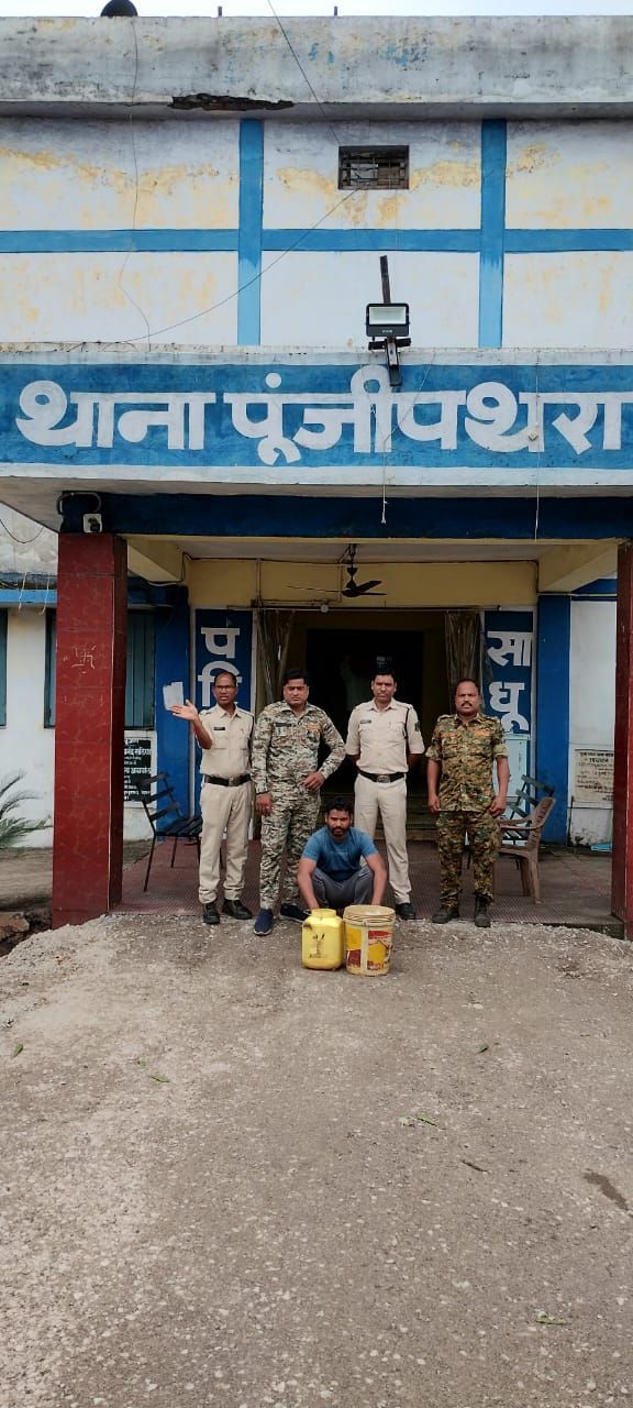 *16 जुलाई, रायगढ़* । कल दिनांक 15.07.2024 को पूंजीपथरा पुलिस द्वारा मुखबीर सूचना पर इंदिराआवास तुमीडीह में भरत सागर के मकान पर दबिश दिया गया । पुलिस को सूचना मिली थी कि भरत सागर अपने घर में भारी मात्रा में महुआ शराब बिक्री हेतु रखा है । रेड दौरान घर में मिले भरत सागर को शराब बेचने के संबंध में कड़ाई से पूछताछ करने पर शराब बिक्री करना स्वीकार किया जिसके कब्जे से 250-250 एम एल 39 नग पन्नी पाउच एवं 500- 500 एम एल 18 नग पन्नी पाउच शराब तथा एक पीला रंग के प्लास्टिक डिब्बा में करीब 04 लीटर महुआ शराब *जुमला 22 लीटर कीमती ₹2,200* का जप्त किया गया है । *आरोपी भरत सागर पिता शत्रुघन सागर उम्र 34 वर्ष निवासी इंदिराआवास तुमीडीह थाना पूंजीपथरा जिला रायगढ़* के कृत्य पर थाना पूंजीपथरा में धारा 34(2),59(क) आबकारी एक्ट की कार्रवाई की गई है । शराब रेड कार्यवाही में प्रधान आरक्षक विनीत तिर्की, आरक्षक बालचंद राव, धर्मेन्द्र सिंह और अभिषेक द्विवेदी शामिल थे ।