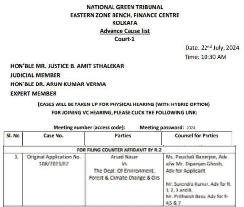 साहिबगंज।चर्चित सामाजिक कार्यकर्ता सह पर्यावरण प्रेमी सैयद अरशद नसर द्वारा टाटी नदी व सरकारी सड़क किनारे लगे पेड़ों को बिना किसी अनुमति के काटने को लेकर एनजीटी पुर्वी जोन कोलकाता में दायर याचिका संख्या-108/2023 की सुनवाई आज एनजीटी में होगी.सुनवाई पुर्व डीएम को जवाबी हलफनामा दाखिल करना है.विदित हो की एसपी व डीएफओ द्वारा जवाबी हलफनामा दाखिल कर दिया गया है.सुनवाई में भाग लेने के लिए अरशद भी कोलकाता पहुँच गए हैं.आज की सुनवाई पर सभी की नजरें टिक गईं है.