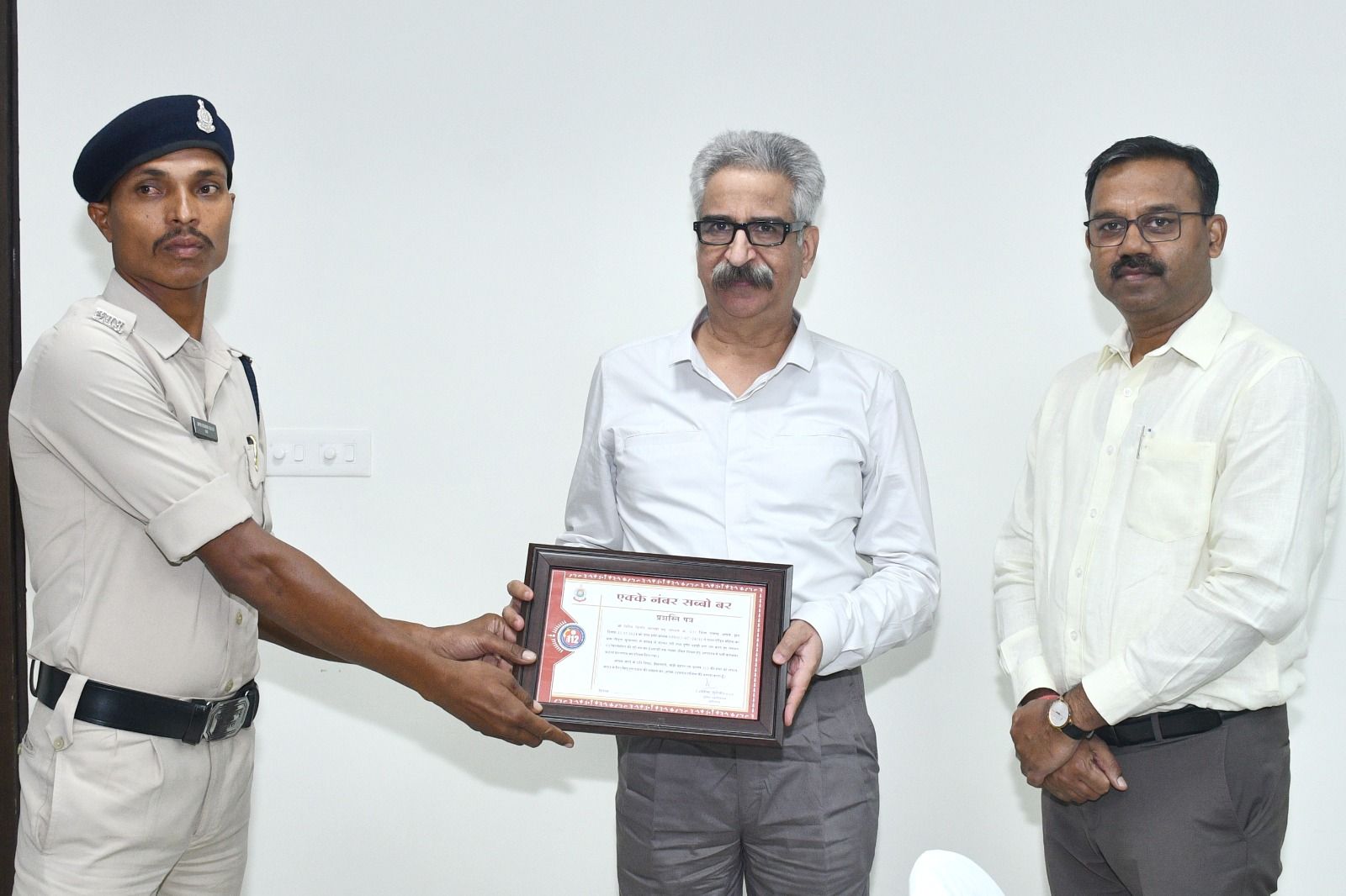डायल 112 टीम के कर्मचारी आरक्षक 637 बिपिन किशोर खलखो एवं चालक छोटू दास को पुलिस मुख्यालय में पुलिस महानिदेशक श्री अशोक जुनेजा (भा.पु.से.) द्वारा नगद पुरस्कार एवं प्रशस्ति पत्र देकर सम्मानित किया गया, इस अवसर पर अति. पुलिस महानिदेशक श्री प्रदीप गुप्ता, पुलिस अधीक्षक (डायल 112) श्री अविनाश ठाकुर एवं डायल 112 के स्टाफ उपस्थिति रहे।