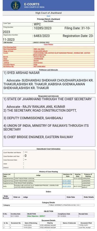 ाहिबगंज।चर्चित सामाजिक कार्यकर्ता सह पर्यावरण प्रेमी सैयद अरशद नसर ने लोगों को प्रायः लगने वाले लंबे अंतराल के भारी जाम से मुक्ति दिलाने के लिए शहर के पश्चिम रेलवे फाटक पर ओभर ब्रिज़ निर्माण को लेकर झारखंड हाईकोर्ट में हाईकोर्ट के विद्वान अधिवक्ता सुधांशु शेखर चौधरी के माध्यम से जनहित याचिका WP (6483) दायर की है.याचिका एडमिट होने के पश्चात रेल मंत्रालय भारत सरकार,चीफ़ ब्रिज़ इंजीनियर पुर्वी जोन कोलकाता,सुबे के मुख्य सचिव,सुबे के पीडब्ल्यूडी सचिव व जिले के डीसी को नोटिस निर्गत हुआ है.अरशद ने बताया कि इस मामले को लेकर वर्ष 2010 में भी जनहित याचिका दायर किया था जिसके पश्चात रेलवे व झारखंड सरकार ने ओभर ब्रिज़ निर्माण को लेकर रेस होते हुए डीपीआर भी बनाया गया था अब सिर्फ टेंडर होना बाकी था पर कतिपय राजनीतिक दबाव के चलते इस योजना को ठंडे बस्ते में डाल दिया गया जिसको लेकर जिले वासियों में भारी जन आक्रोश है.जिसको लेकर वो एक बार फिर से सक्रिय हो गये हैं और इस बार वो ओभर ब्रिज़ निर्माण करवाने को लेकर अंतिम क्षण तक उनका संघर्ष जारी रहेगी.अरशद के इस सकारात्मक व रचनात्मक प्रयास से लोगों में खुशी की लहर है और अब लोगों में आशा जगी है की अब जल्द ही लोगों को पश्चिम रेल फाटक पर लगने वाली भारी जाम से मुक्ति मिल जाएगी.इस मामले की सुनवाई हाईकोर्ट के चीफ़ जस्टिस के बेंच में सूचीबद्ध है.