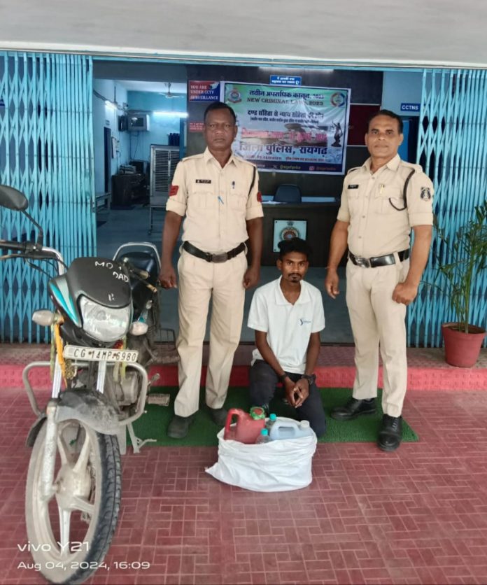 *04 अगस्त, रायगढ* । पुलिस अधीक्षक श्री दिव्यांग कुमार पटेल के दिशा निर्देशन पर अवैध शराब,जुआ सट्टा, कबाड़ पर अंकुश लगाने की दिशा में कोतरारोड़ पुलिस सूचनाओं पर लगातार कार्यवाही की जा रही है तथा डीएसपी अखिलेश कौशिक के मार्गदर्शन पर थाना प्रभारी कोतरारोड़ निरीक्षक त्रिनाथ त्रिपाठी द्वारा थाने के सभी स्टाफ को ड्यूटी दौरान अवैध गतिविधियों पर निगाह रखने निर्देशित किया गया है । इसी कड़ी में आज दिनांक 04/08/2024 हरेली त्यौहार पर शांति व्यवस्था ड्यूटी एवं अवैध शराब की तस्करी पर निगाह रखने थाना प्रभारी कोतरारोड़ द्वारा अपने स्टाफ को निर्देशित किया गया था, किरोड़ीमल क्षेत्र में ड्यूटी पर लगे स्टाफ को मुखबिर से सूचना मिली कि एक मोटरसाइकिल एचएफ डीलक्स पर एक व्यक्ति किरोड़ीमल से परसदा की ओर अवैध शराब लेकर जा रहा है । सूचना पर तत्काल कार्यवाही करते हुए कोतरारोड़ पुलिस द्वारा चिरईपानी तिराहा के पास नाकेबंदी किया गया दोपहर करीब 2:00 बजे मोटरसाइकिल पर संदेही युवक को पकड़ा गया पूछताछ पर संदेही अपना नाम *किशनलाल सारथी पिता कुलधर सारथी उम्र 21 साल निवासी मिलूपारा तमनार हाल मुकाम ग्राम परसदा थाना भूपदेवपुर* का रहने वाला बताया जिसके कब्जे से पुलिस ने 12 लीटर महुआ शराब और शराब परिवहन में प्रयुक्त मोटरसाइकिल एचएफ डीलक्स सीजी 14 एमपी 6980 को जप्त किया गया है । आरोपी के कृत पर थाना कोतरारोड़ में धारा 34(2), 59 (क) आबकारी एक्ट के तहत कार्यवाही किया गया है । शराब रेड कार्यवाही में थाना प्रभारी कोतरारोड़ निरीक्षक त्रिनाथ त्रिपाठी, प्रधान आरक्षक शंकर राम कालो, आरक्षक चंद्रेश पांडेय और शिवा प्रधान शामिल रहे ।