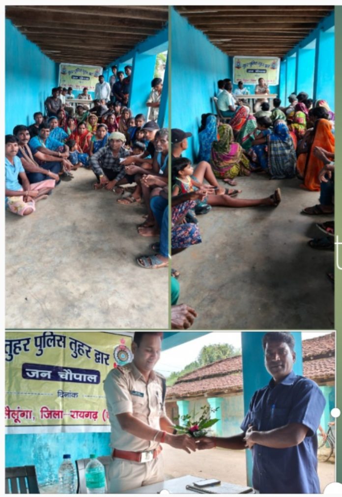 लैलूंगा / रायगढ़ जिले के लैलूंगा थाना क्षेत्र के ग्राम हीरापुर में तुहर पुलिस तुहर द्वार अभियान के तहत जन चौपाल आयोजित की गई जिसमे युवाओं सहित महिला पुरुष सभी को जागरूक करने के लिए थाना प्रभारी राजेश कुमार जांगड़े ने थाना क्षेत्र में सायबर अपराध सहित नशे का कारोबार करने वालो के खिलाफ अभियान शुरू की गई है। इन दिनों नशे की जद में सबसे ज्यादा नाबालिग शामिल हैं। नशीली टेबलेट,सिरप और गांजा का सेवन कर लूटपाट,मारपीट सहित अन्य वारदातों को अंजाम दे रहे हैं। वही लैलूंगा थाना क्षेत्र में ज्यादा हत्या,शराब के नशे में किया जा रहा है शराब के नशे में आकर छोटी छोटी बातों को लेकर कभी भाई तो कभी पति पत्नी को हत्या कर रहे ऐसे स्थिति को देखते हुए भविष्य अंधकार नजर आ रहा है नाबालिगों के बढ़ते अपराध के आंकड़ों का विषय काफी चिंचित है इससे अभी के समय में बचपन खतरे में है जिसका खामियाजा गांव ,शहर को भुगतना पड़ रहा है। वही मोबाइल से अपराध को हो रहे अकाउंट हैक करना otp के जरिए पैसे खाते से ट्रासफर होना कोई भी व्यक्ति द्वारा फोन करके बैंक से संबधित कुछ जानकारी कुछ भी मांगे तो नही देना है सीधा बैंक जानकर जानकारी लेना है ऐसे बहुत सारे अपराध को समय रहते इसमें सुधार नहीं हुआ तो आने वाले समय में हालात ज्यादा बिगड़ने से इन्कार नहीं किया जा सकता है। नाबालिगों को अपराध से दूर रखने और युवावस्था को सुधारने पुलिस ने काम शुरू कर दिया है। गांव गांव जाकर पुलिस समझा रही है कि बच्चे क्या करते हैं, इसके बारे में पूरी जानकारी रखें। नाबालिक बच्चो द्वारा मोटर साइकिल चलाना गैर कानूनी है यातायात नियमों की जानकारी आप सबको रखना होगा बाइक में सलेंसर निलवाकर चलाने वाले लडको पर पुलिस कठोर कार्यवाही करेगी यातायात नियमों की जानकारी देते हुए थाना प्रभारी ने बताया कि यातायात नियमों की जानकारी नहीं होने की वजह से ज्यादातर दुर्घटनाएं होती हैं। वहीं,नशे में वाहन चलाने से हादसे हो रहे हैं। उन्होंने बच्चों से कहा कि स्वजनों को बिना हेलमेट घर से बाहर न निकलने दें।