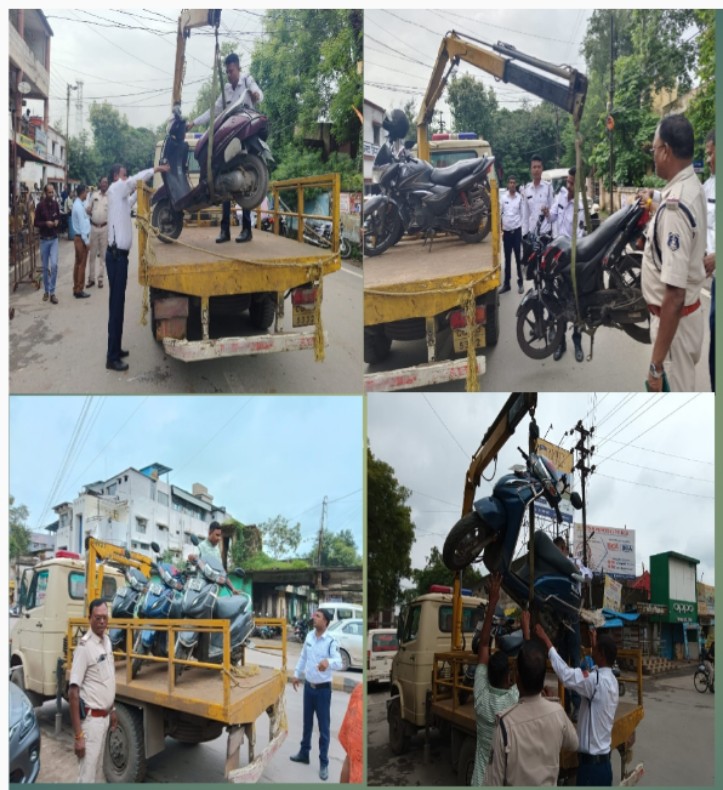 *07 अगस्त, रायगढ़*। एसपी श्री दिव्यांग कुमार पटेल के दिशा निर्देशन एवं ट्रैफिक डीएसपी रमेश कुमार चन्द्रा के मार्गदर्शन पर सुगम यातायात के लिए शहर के प्रमुख चौंक-चौराहों पर ट्रैफिक पुलिस के जवान तैनात हैं, यातायात पुलिस की टाऊन पेट्रोलिंग निरंतर पेट्रोलिंग कर व्यवस्था दुरूस्त करने में लगी है । साथ ही नियमों की अनदेखी करने वालों पर यातायात पुलिस कार्रवाई कर रही है । इसी क्रम में आज सुबह ट्रैफिक पुलिस द्वारा अभियान चलाकर एसडीएम कार्यालय रायगढ़ के सामने, बेटी बचाओ-बेटी पढ़ाओ चौंक, सत्तीगुडी चौंक में ‘नो-पार्किंग’ जोन तथा सड़क ऊपर खड़ी दुपहिया वाहनों को बाइक क्रेन से उठवाकर थाना यातायात लाया गया। ट्रैफिक डीएसपी रमेश चन्द्रा को इन क्षेत्रों में वाहन चालकों द्वारा बेतरतीब वाहन खड़ी कर सड़क को जाम करने की शिकायत मिली थी । कार्रवाई दौरान टोइंग क्रेन द्वारा 08 दुपहिया वाहन को थाना लाया गया था जिन पर मोटर व्हीकल एक्ट की धारा 117/177, 119/177, 127(3) के तहत 700 रूपये का समन शुल्क काटा गया है । ट्रैफिक डीएसपी ने बताया कि यह कार्यवाही निरंतर जारी रहेगी ।