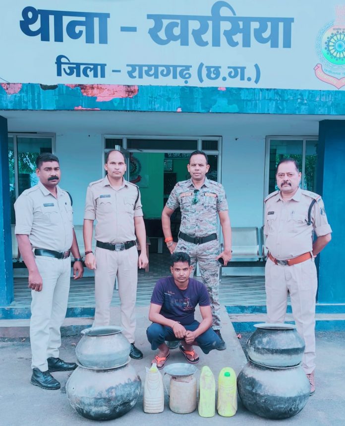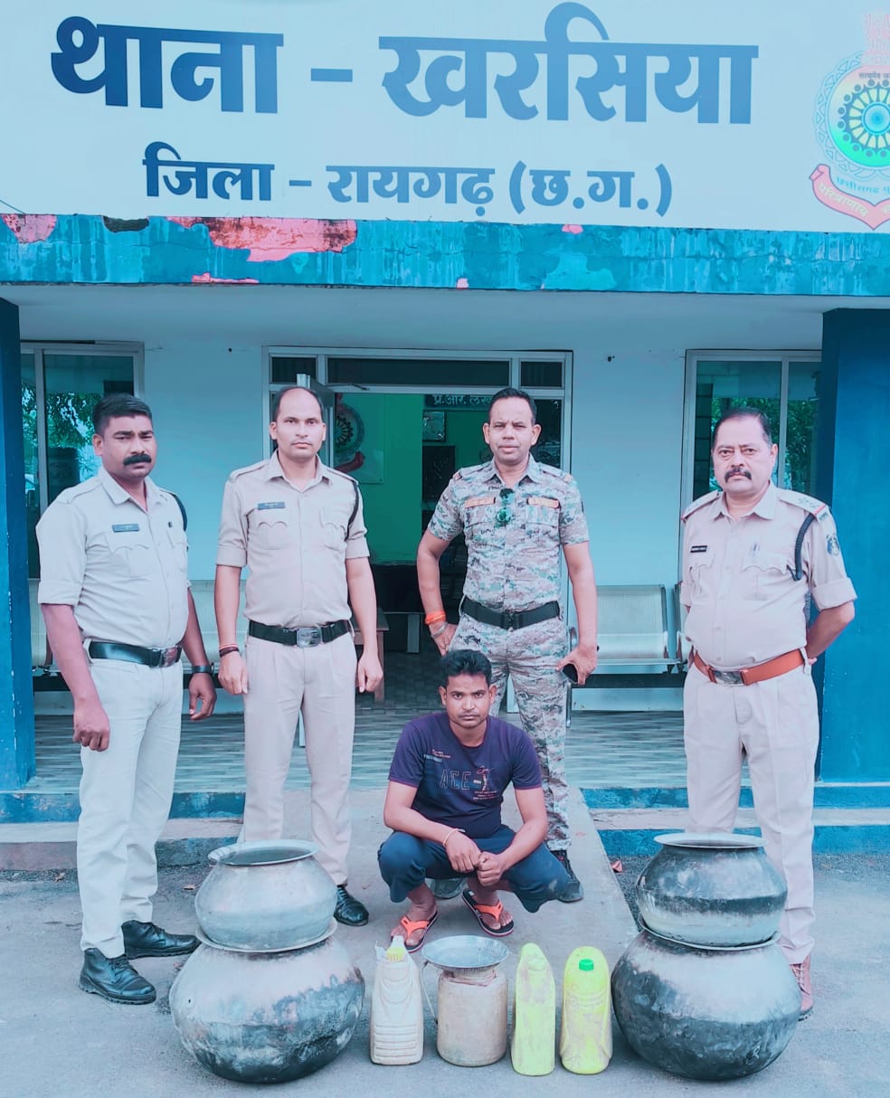 *07 अगस्त, रायगढ़* । आज दिनांक 07.08.2024 को खरसिया पुलिस द्वारा सक्रिय शराब अभियान के तहत थाना प्रभारी श्री कुमार गौरव साहू के नेतृत्व में पुलिस टीम ने भदरीपाली गांव में अवैध महुआ शराब निर्माण पर शराब रेड कार्रवाई किया गया है। इस कार्रवाई में पुलिस टीम ने तालाब के किनारे बने चुल्हे पर बड़े-बड़े बर्तनों में कच्ची महुआ शराब बनाते हुए भेषज कुमार डनसेना (34 साल) भदरीपाली को रंगे हाथों पकड़ा। मौके पर से 20 लीटर कच्ची महुआ शराब और कई मोडीफाई किया सिल्वर बर्तन बरामद किए गए। आरोपी पर आबकारी एक्ट की धारा 34(2),59(क) की कार्रवाई कर गिरफ्तार कर न्यायिक रिमाण्ड पर जेल भेज दिया गया है । वरिष्ठ पुलिस अधिकारियों के मार्गदर्शन व थाना प्रभारी खरसिया निरीक्षक कुमार गौरव साहू के नेतृत्व में हुई इस कार्रवाई में उप निरीक्षक अमरनाथ शुक्ला, सउनि लक्ष्मीनारायण राठौर, प्र.आर. बिरीछराम साण्डे, आर. प्रदीप तिवारी, विशोप सिंह, सत्यनारायण सिदार, रमेश बरेठ शामिल थे ।