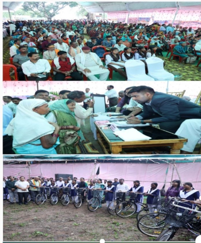 तोलगे में आयोजित जनसमस्या निवारण शिविर में महिला एवं बाल विकास विभाग के माध्यम से 6 विद्यार्थियों को यूनिफार्म वितरण एवं 4 महिलाओं की गोद भराई की गई। उद्यान विभाग द्वारा 4 कृषकों को मौसम आधारित फसल बीमा योजनान्तर्गत बीमा पॉलिसी पेपर वितरण, 3 महिला स्व-सहायता समूहों को सिडलिंग पौधा वितरण एवं मनरेगा योजनान्तर्गत पौध वितरण किया गया। स्वास्थ्य विभाग द्वारा 6 लोगों का आयुष्मान कार्ड बनाया गया। खाद्य विभाग द्वारा 11 लोगों का राशन कार्ड एवं मत्स्य विभाग द्वारा 3 लोगों को सामग्री वितरण, समाज कल्याण विभाग द्वारा 4 दिव्यांग बच्चों को सहायक उपकरण प्रदान किया गया। राष्ट्रीय ग्रामीण आजीविका मिशन अंतर्गत 5 स्व-सहायता समूह को 6-6 लाख रुपये बैंक लिंकेज की राशि प्रदान की गई। शिविर में 23 छात्र-छात्राओं को जाति-निवास प्रमाण-पत्र प्रदान किया गया। इसी प्रकार सरस्वती सायकल योजनान्तर्गत 28 छात्राओं को नि:शुल्क सायकल का वितरण किया गया। मौके पर दो लोगों को ऋण पुस्तिका प्रदाय किया गया।