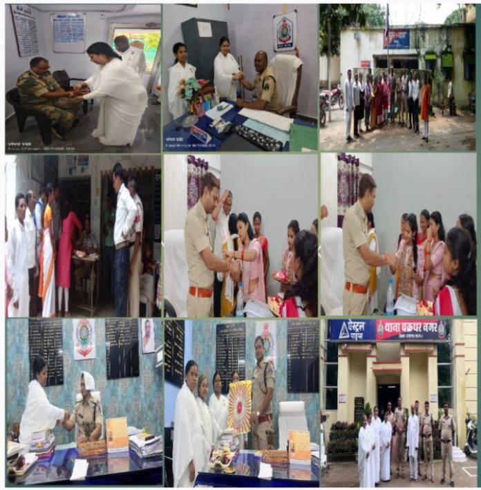 *19 अगस्त रायगढ़*। रक्षाबंधन के पावन अवसर पर प्रजापिता ब्रह्माकुमारी ईश्वरीय विश्वविद्यालय की बहनों ने थाना चक्रधरनगर के प्रभारी निरीक्षक प्रशांत राव आहेर और उनके स्टाफ को राखी बांधकर त्यौहार मनाया। पुलिस चौकी खरसिया में भी ब्रह्मकुमारी बहनों ने पुलिसकर्मियों को राखी बांधी ।इस भावनात्मक मौके पर पुलिसकर्मियों और बहनों के बीच भाईचारे का अनूठा संगम देखने को मिला।