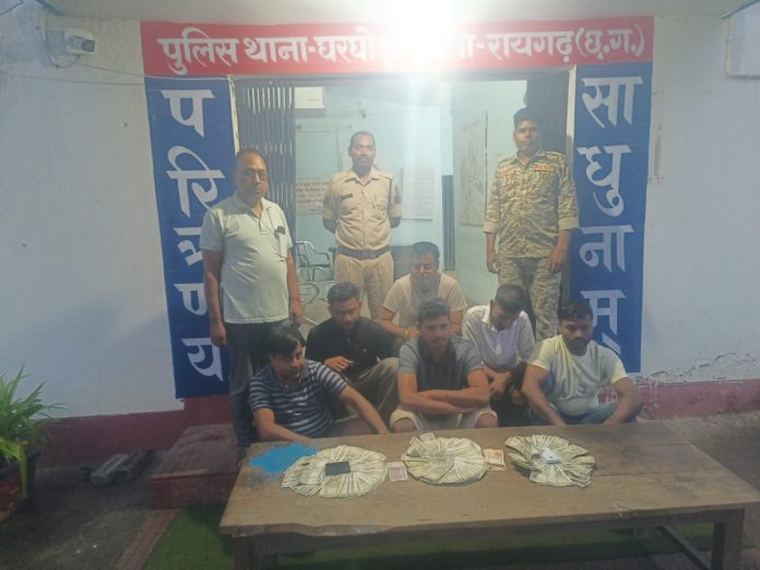 *25 अगस्त, रायगढ़* । कल दिनांक 24.08.2024 को घरघोड़ा टीआई अमित कुमार तिवारी को मुखबिर से सूचना प्राप्त हुई कि ग्राम कटंगडीह के जंगल में मेन रोड किनारे कुछ लोग हार-जीत के नाम पर ताश के पत्तों से जुआ खेल रहे हैं। सूचना की पुष्टि के बाद टीआई अमित कुमार तिवारी ने हमराह स्टाफ और गवाहों के साथ ग्राम कटंगडीह की ओर रवाना होकर घेराबंदी की। पुलिस को देख कुछ जुआरी भागने में सफल रहे, जबकि 6 आरोपियों को मौके पर गिरफ्तार कर लिया गया।